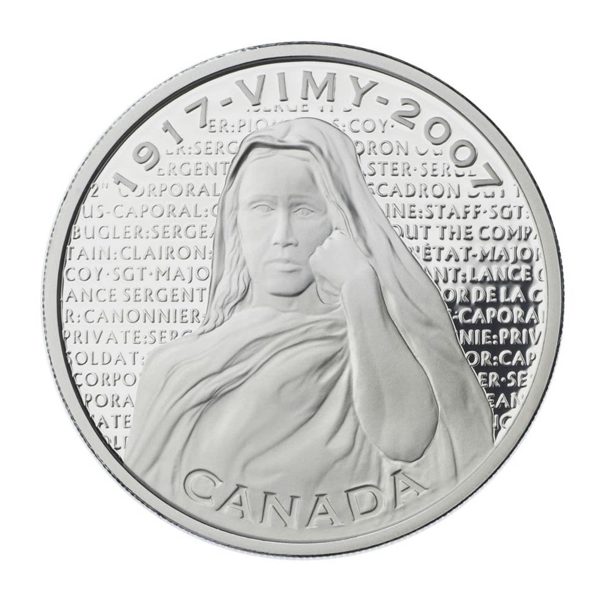 Considered one of Canada's greatest achievements of the war, the victory at Vimy Ridge is memorialized in a commanding monument designed by Canadian sculptor and architect Walter Seymour Allward. The pylons represent Canada and France and at 27 m (88.5 ft) tall, dominate the site. In various locations throughout the memorial, twenty massive statues convey symbolic messages of peace, justice and gallantry while the names of Canadian soldiers who lost their lives in France and have no known grave are engraved in the monument's walls. The memorial was originally unveiled in 1936 and underwent a major restoration project prior to its rededication in 2007, on the 90th anniversary of victory at Vimy Ridge. The reverse design features one of the statues of the Canadian National Vimy Memorial. Entitled, "Canada, a young nation mourning her fallen sons," it depicts a forlorn woman dressed in robes. The background is representative of the lists of names that are found at the site.