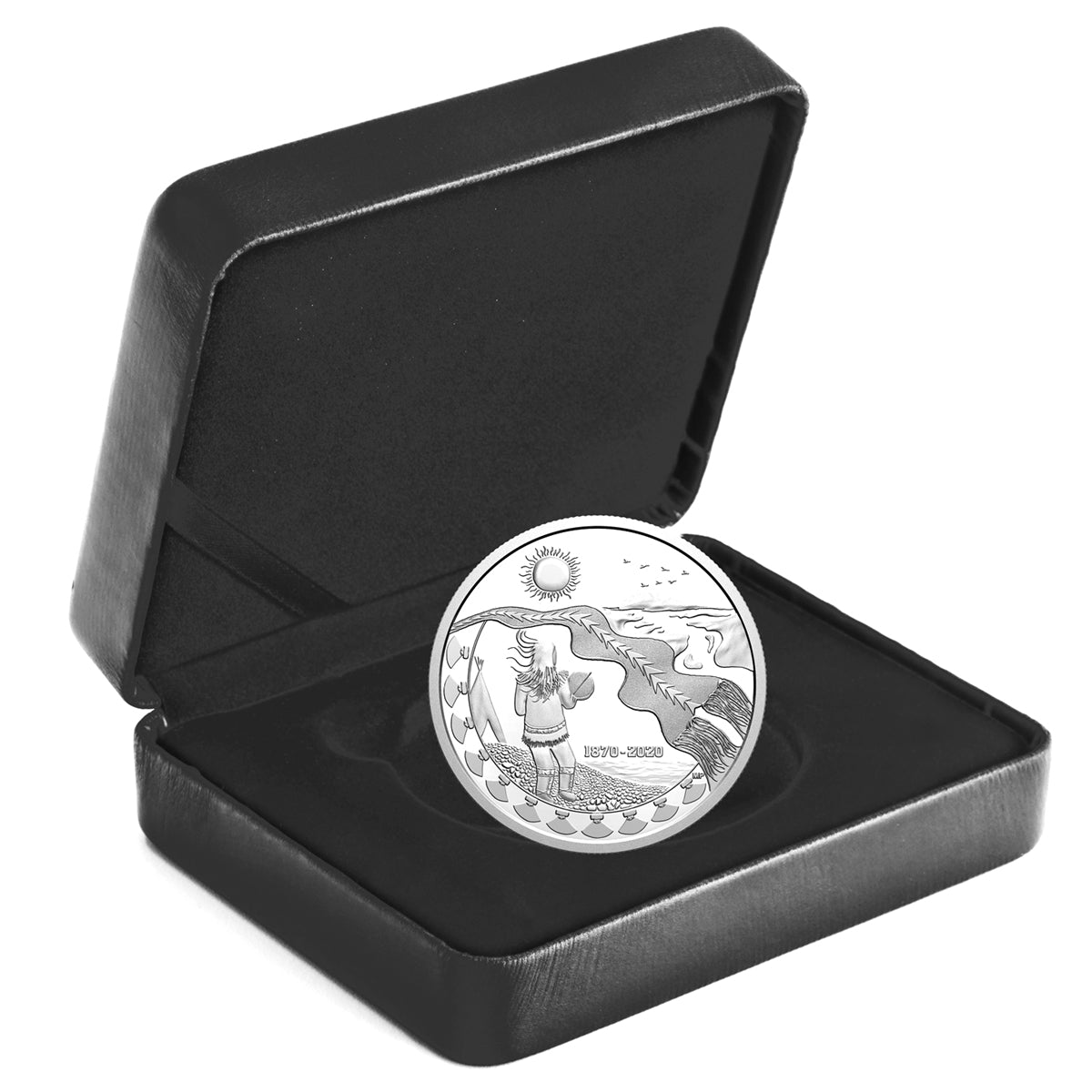 It was 150 years ago, in 1870 that the transfer of Rupert's Land and the North-Western Territory resulted in the establishment of Canada's first territory. The flora, fauna, landscapes and diverse peoples of the Northwest Territories have made it a cherished part of our Canadian family. But our "oldest" territory is also young at heart, with new generations of artists and innovators that are, today, looking to the past to shape the future of the North. This 2 oz. fine silver coin commemorates the 150th anniversary of the Northwest Territories' entry into Confederation. Its reverse design is an artistic expression of pride for the territory's medley of cultures, and for the land that has sustained its inhabitants since time immemorial.