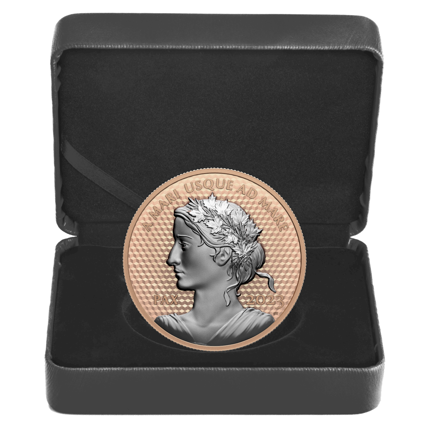 Each Peace Dollar is a powerful representation of Canada’s ongoing dedication to universal human rights and world peace. Before becoming Prime Minister of Canada, Lester B. Pearson was awarded a Nobel Peace Prize in 1957 for organizing the first UN peacekeeping force. In the decades since, UN peacekeepers have helped de-escalate conflicts and save lives throughout the world. That legacy of peace and international cooperation is reflected on the reverse of the 65.25 mm reverse of this 5oz. 99.99% pure silver coin. It combines three extraordinary features: Ultra High Relief (UHR), rose gold plating (new for 2023) and a specially engineered pattern, which pulses with hope for a peaceful and prosperous future.