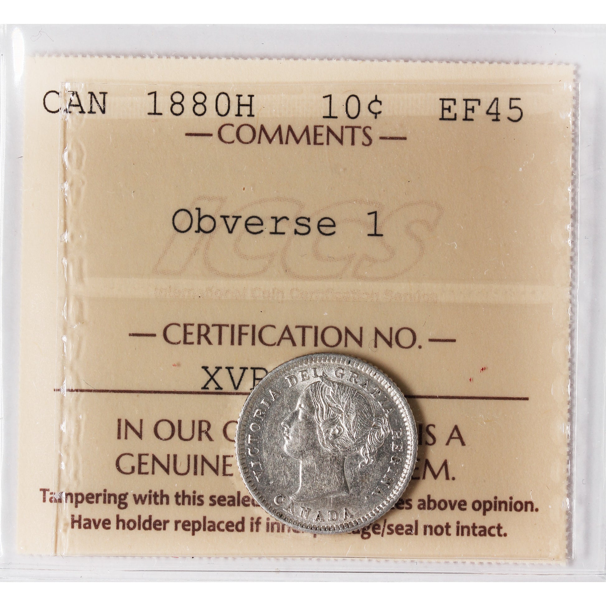 1880H Obv. 1 Canada 10-cents ICCS Certified EF45