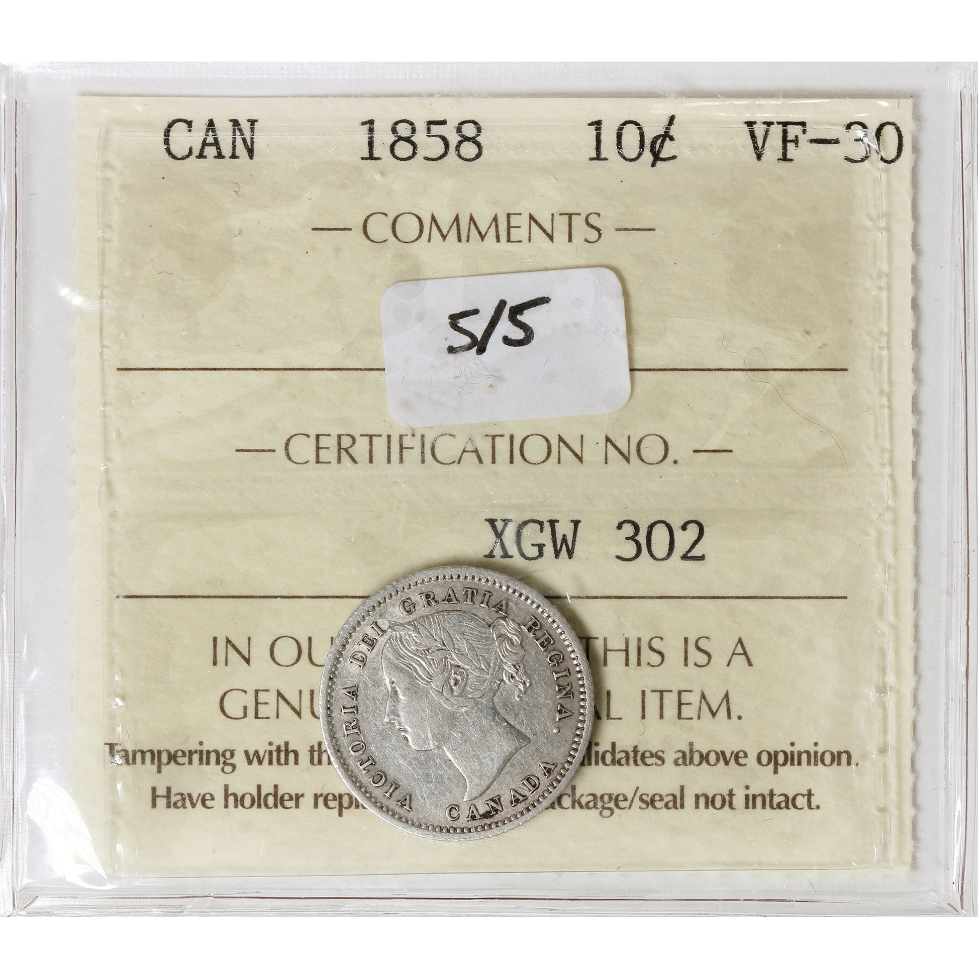 1858 5/5 Canada 10-cents ICCS Certified VF30
