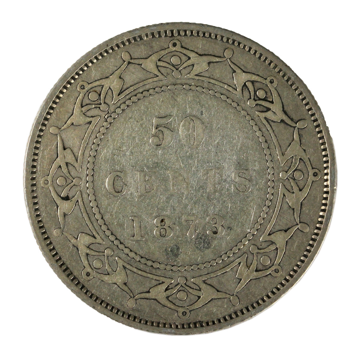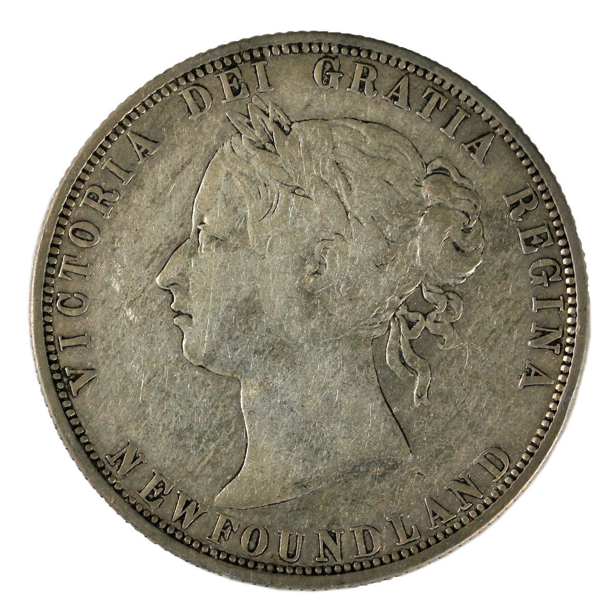 Victoria Obverse Portrait 1: There are four leaves at the top of the laurel crown, and the upper-most leaf enters the legend band between the"E" and "I" in DEI. There is a prominent upper lip. There are no dots before or after NEWFOUNDLAND.