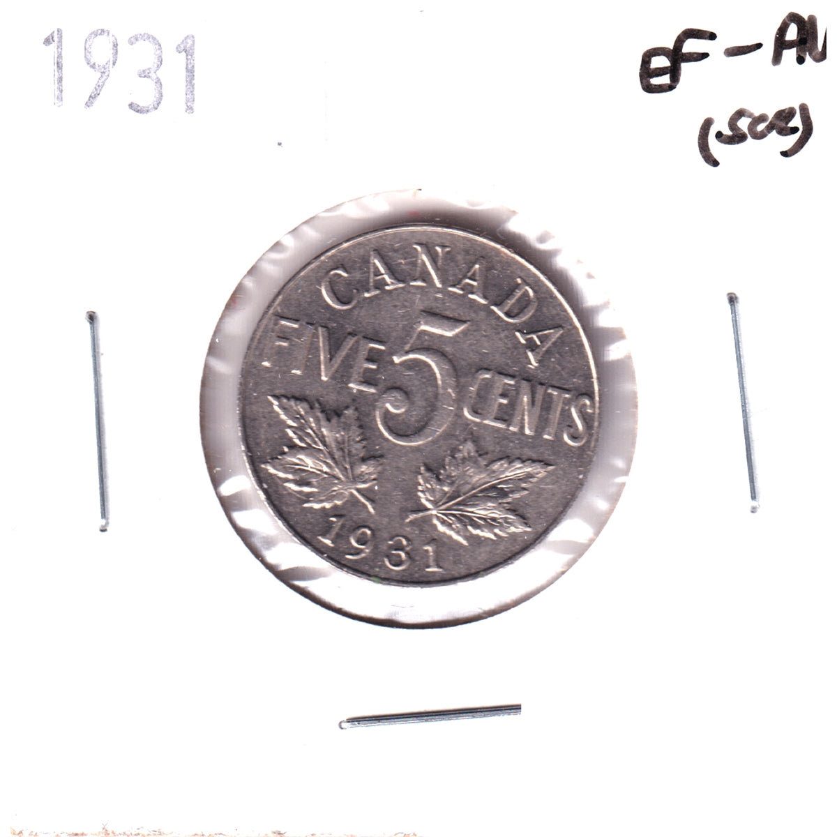 1931 Canada 5-cents EF-AU (EF45) Scratched, toned, corrosion, or impaired