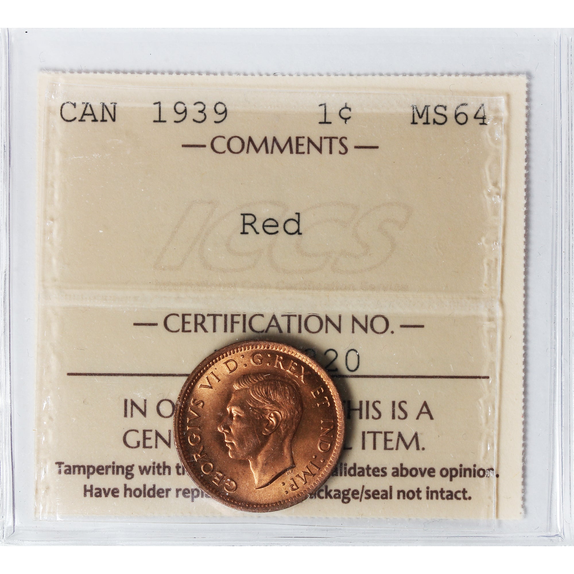 1939 Canada 1-cent ICCS Certified MS64 Red