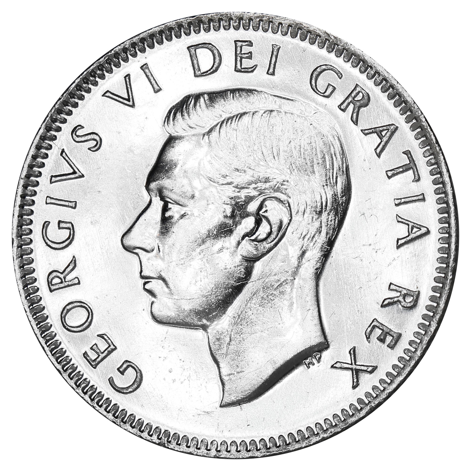 Following the arrival of the master tools with the new obverse legend lacking "ET IND: IMP" in 1948, the production of the 1947 Maple Leaf coinage was terminated. For the remainder of the year, coins were produced with the new obverse and the true date. In an attempt to improve the appearance of the obverse of this denomination, a fresh reduction was made to produce an obverse with a slightly larger, lower relief portrait. Both varieties were struck in 1951 & 1952. Aside from the difference in relief and the size of the portrait, the two varieties can be distinguished by the lettering: the High Relief Variety has a plain lettering style in the legend, and both "A's" in "GRATIA" point to a large rim denticle, while the Low Relief Variety, the letters are more flared, and both the "A's" in "GRATIA" point between small rim denticles. 1951 Low Relief are only in Proof Like conditions.