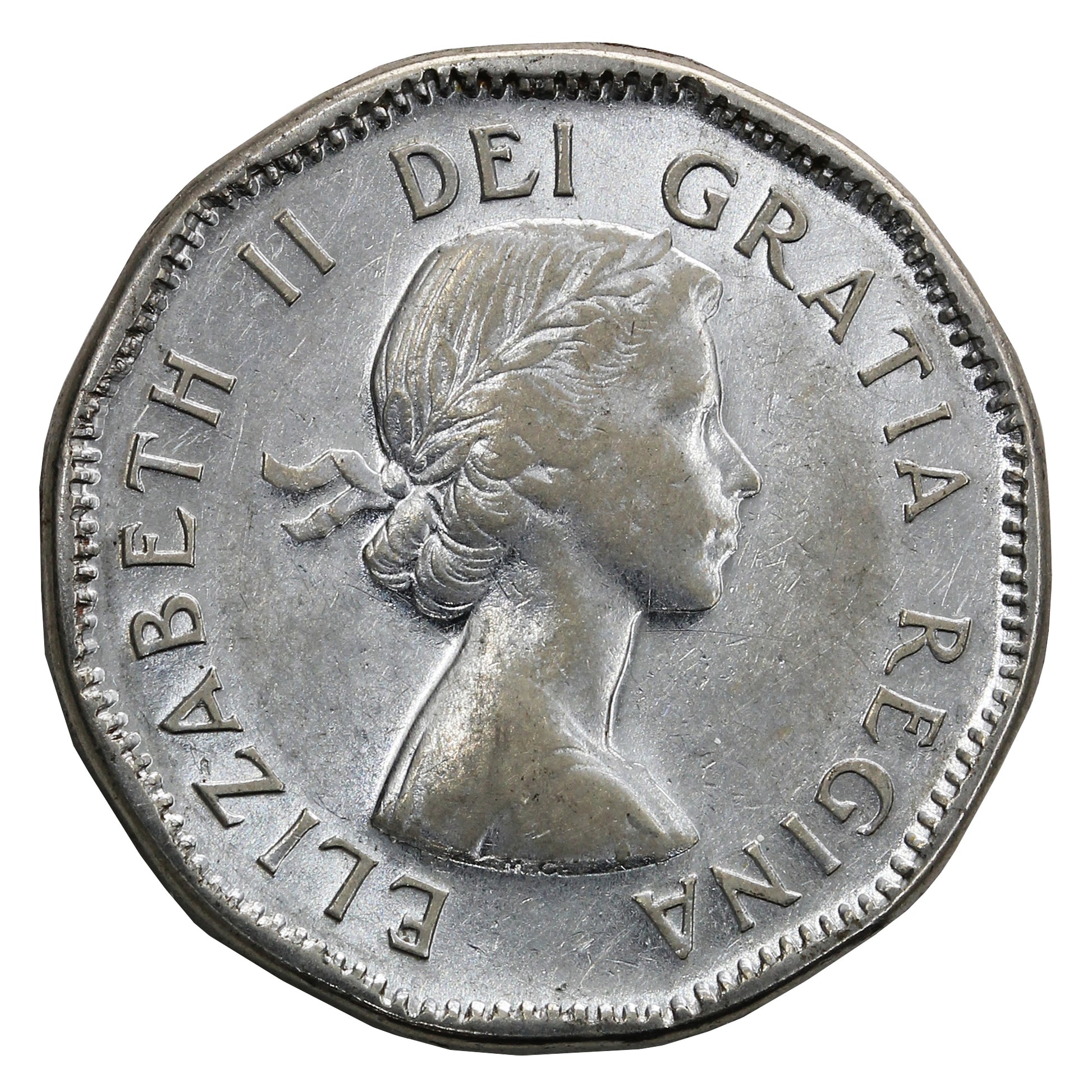 On the Canada 5-cent, these varieties are best distinguished on coins by observing the styles of the letters in the obverse legends; on the No Shoulder Strap variety, the letters are more flared (particularly the E and I of "DEI"), and the Maple Leaf on the reverse is further from the rim of the coin. Shoulder Strap varieties show more straight-sided I's, and the Maple Leaf on the reverse is closer to the rim.