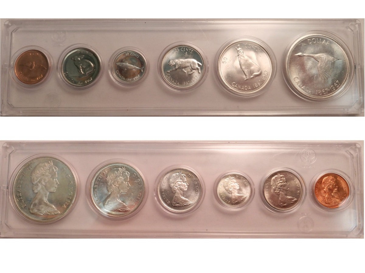 1967 Year Set - All Coins are silver except for the Penny and Nickel. This was Canada's 100th Anniversary. All of the coins have animals on them. All coins are in excellent collectable condition. The coins are contained in a snap-lock case.
