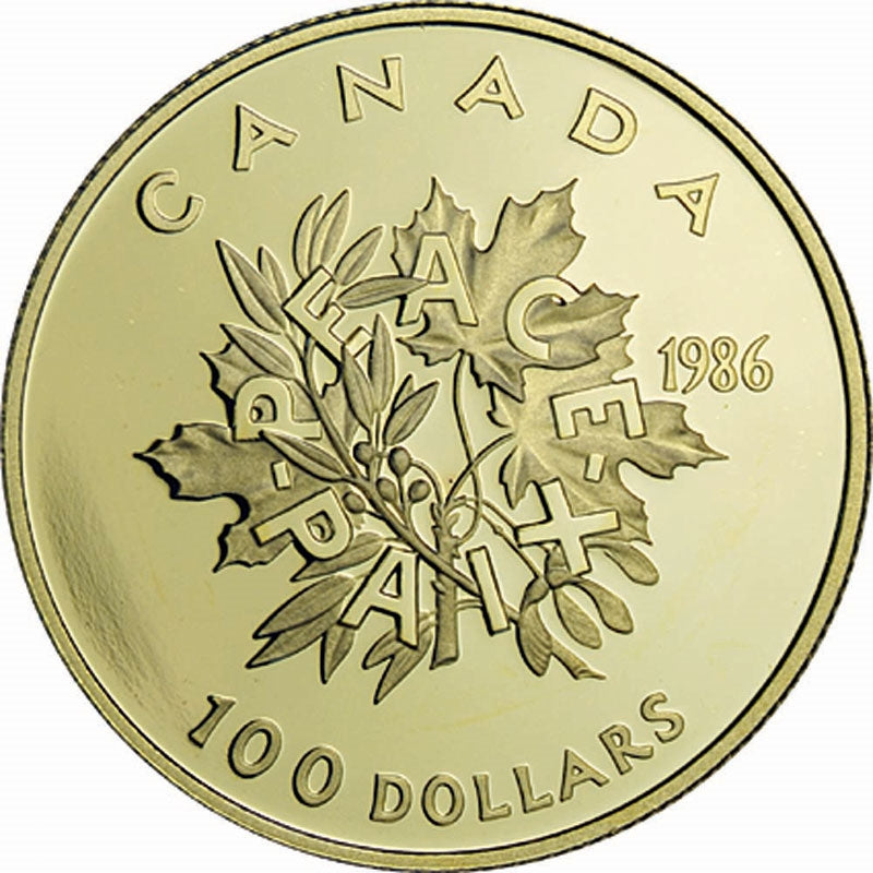 The $100 gold coin for 1986 signifies Canada's support for world peace. The reverse depicts a branch of maple leaves intertwined with a branch of olive leaves, symbols of Canada and Peace coming together. The words "Peace-Paix" forming a circle are superimposed on the design.