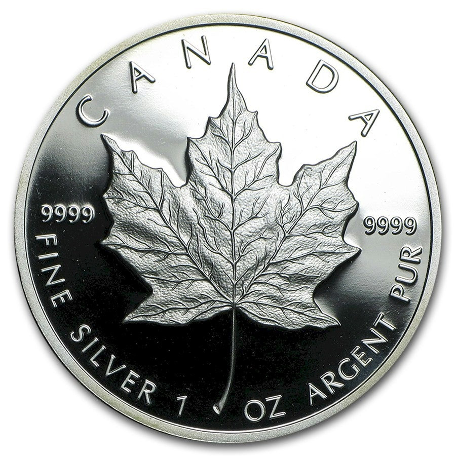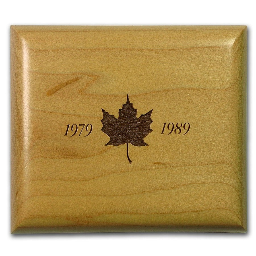 Issued in 1989 in proof condition to commemorate the 10th anniversary of the introduction of the maple leaf in 1979. Coin comes in a clear finish maple wood box with capsule and outer maple leaf printed box.