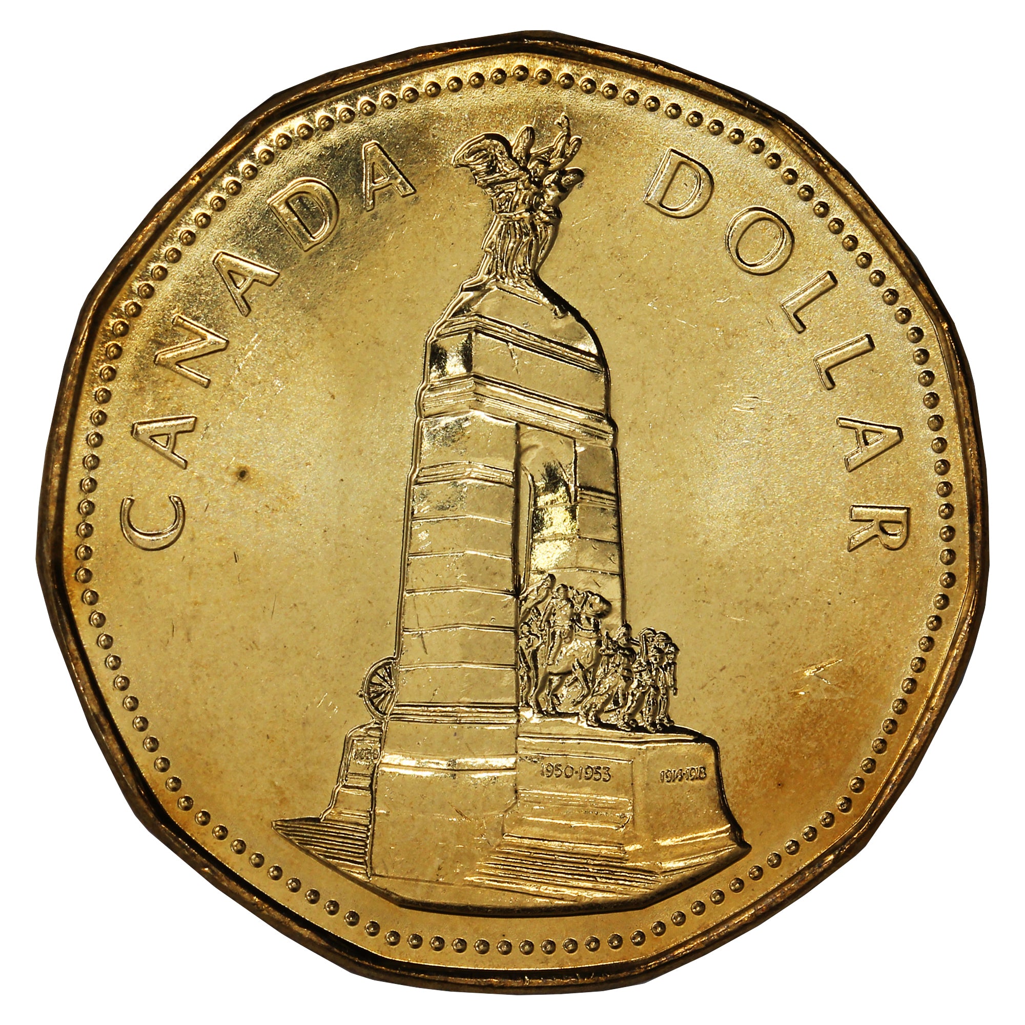 The Remembrance Dollar, depicting the National War Memorial, honours all Canadians who served their country in time of war. The Memorial, created by sculptor Vernon March, stands majestically in Confederation Square in Ottawa, Canada.