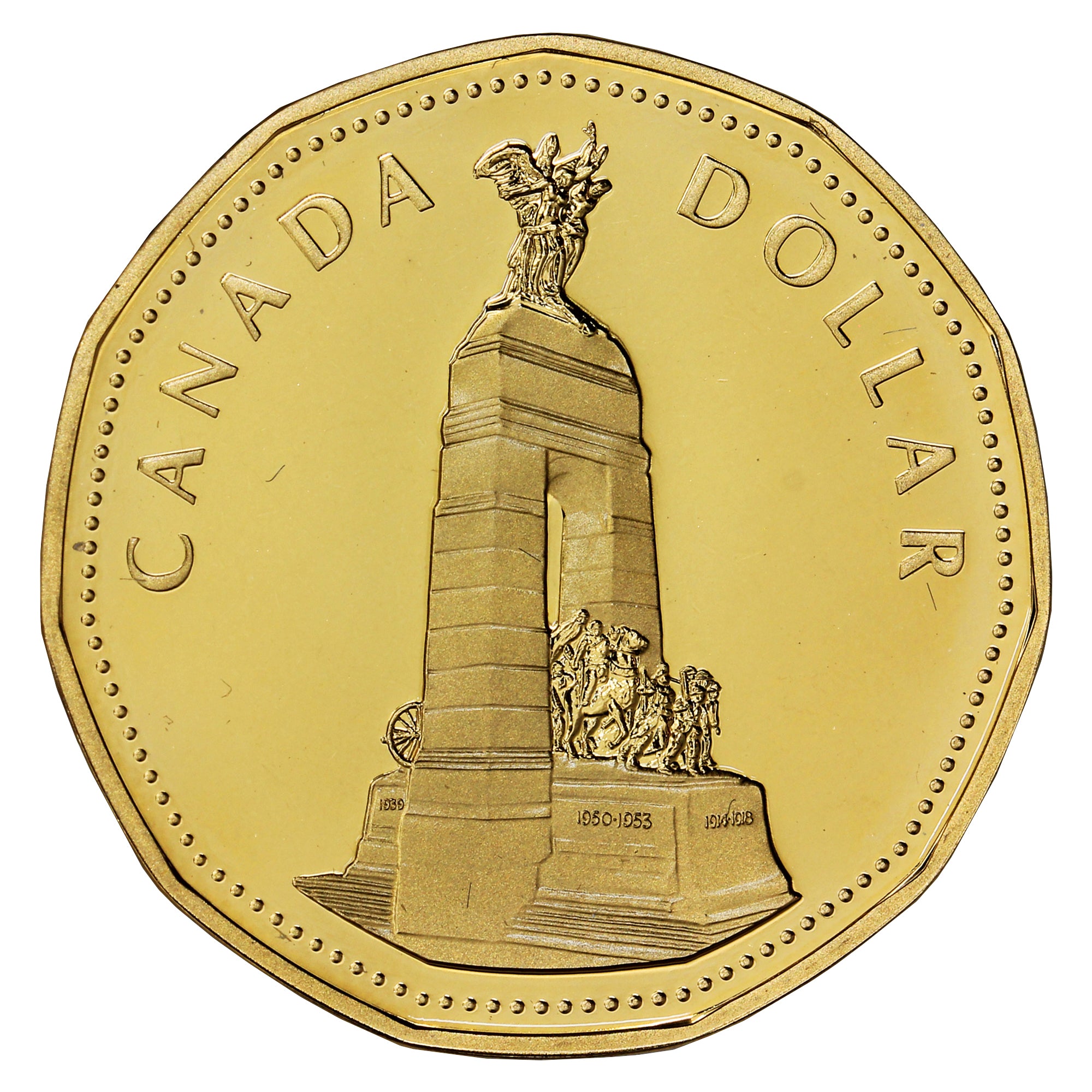 The Remembrance Dollar, depicting the National War Memorial, honours all Canadians who served their country in time of war. The Memorial, created by sculptor Vernon March, stands majestically in Confederation Square in Ottawa, Canada.