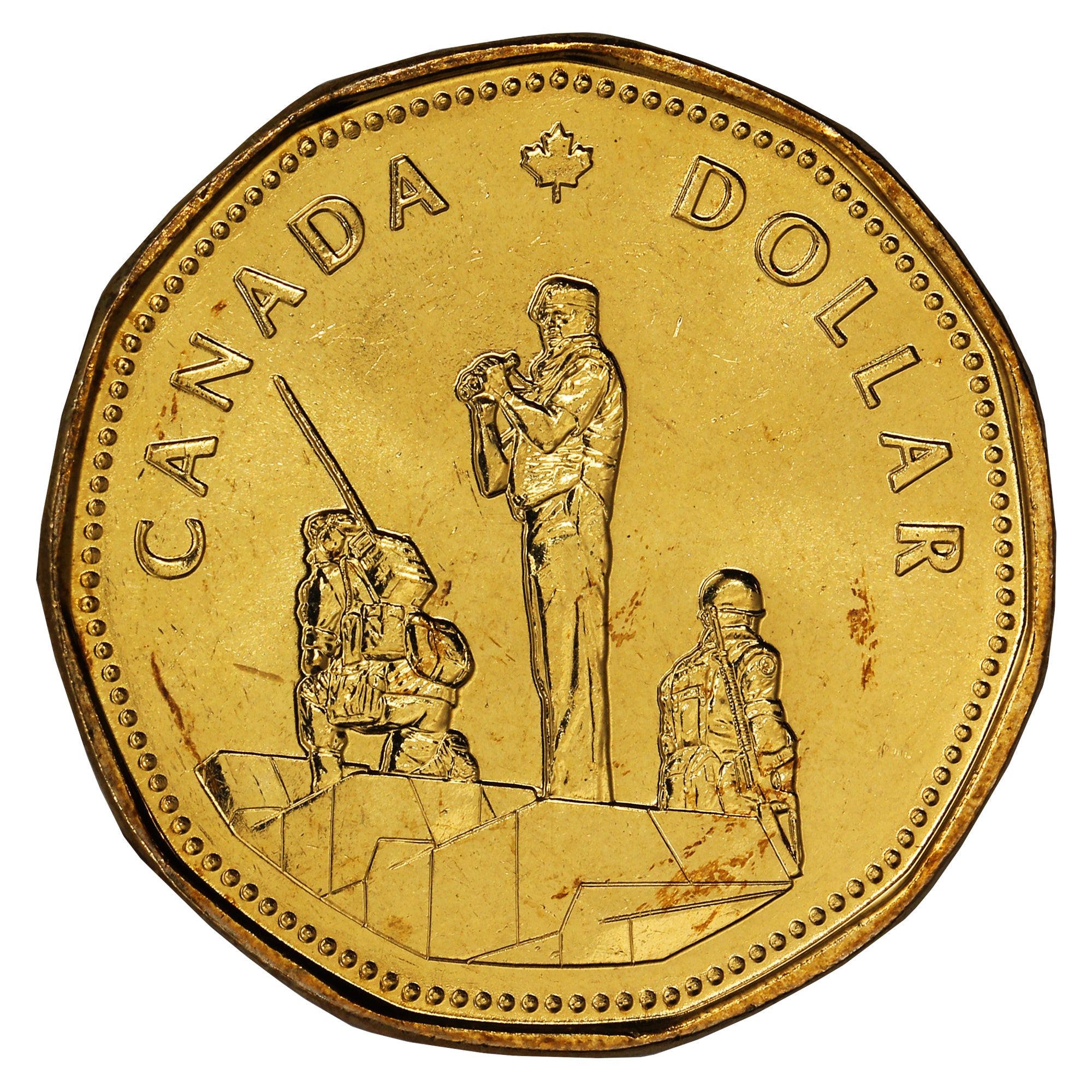 The Peacekeeping dollar was minted to mark the 50th anniversary of the founding of the United Nations and depicts a portion of the Peacekeeping Monument in Ottawa. Created by sculptor Jack K. Harman, the Peacekeeping Monument - The Reconciliation - pays tribute to Canadians to serve as international peacekeepers. The monument is a symbol of national pride and a timeless reminder of Canada's commitment to world peace.