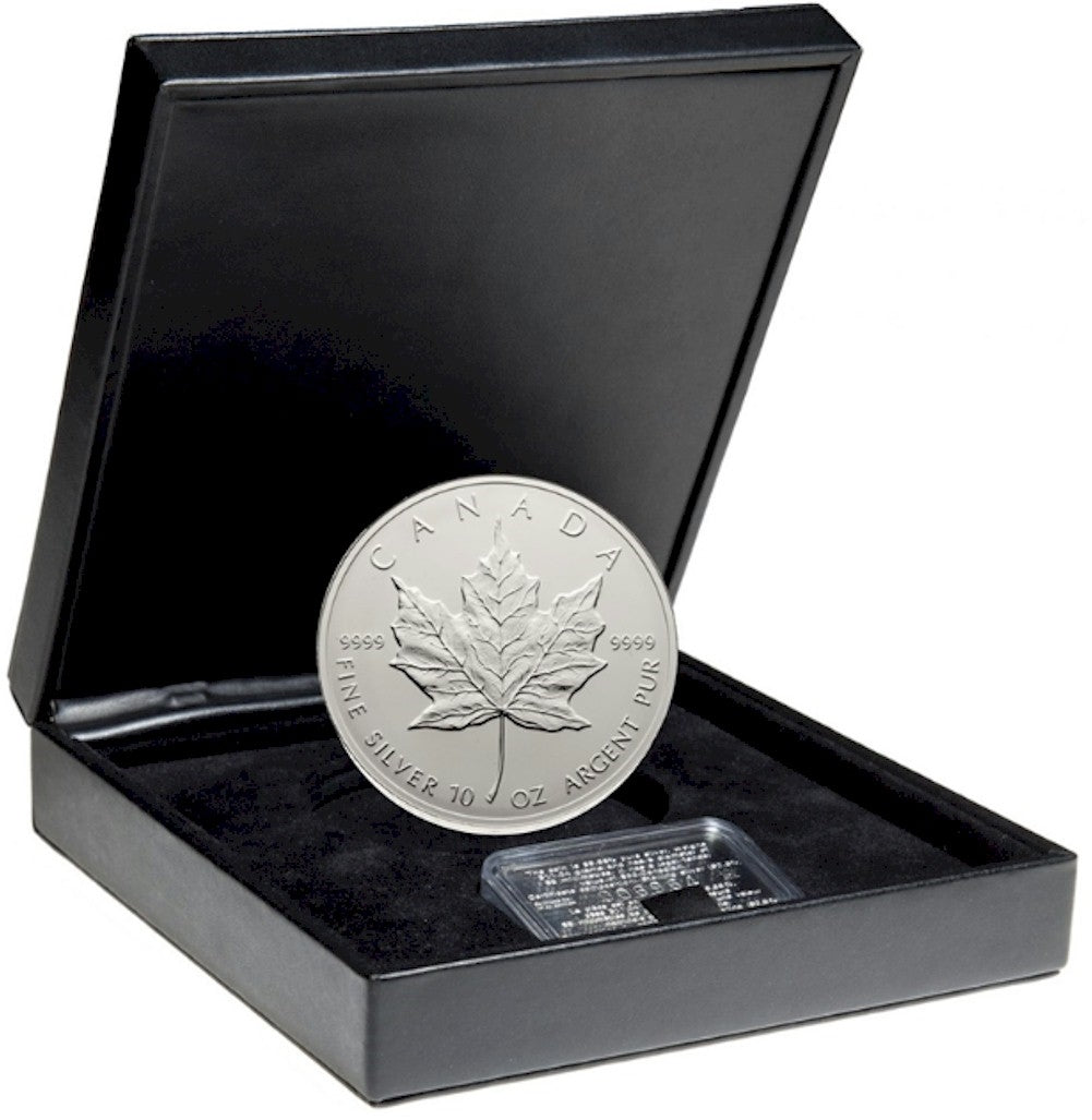 In 1998 the Royal Canadian Mint issued the 10 ounce silver maple in celebration of the 10th anniversary of the silver maple leaf bullion coin. This coin is the largest legal tender Canadian coin ever produced, and is accompanied by a sterling silver certificate plaque of authenticity.