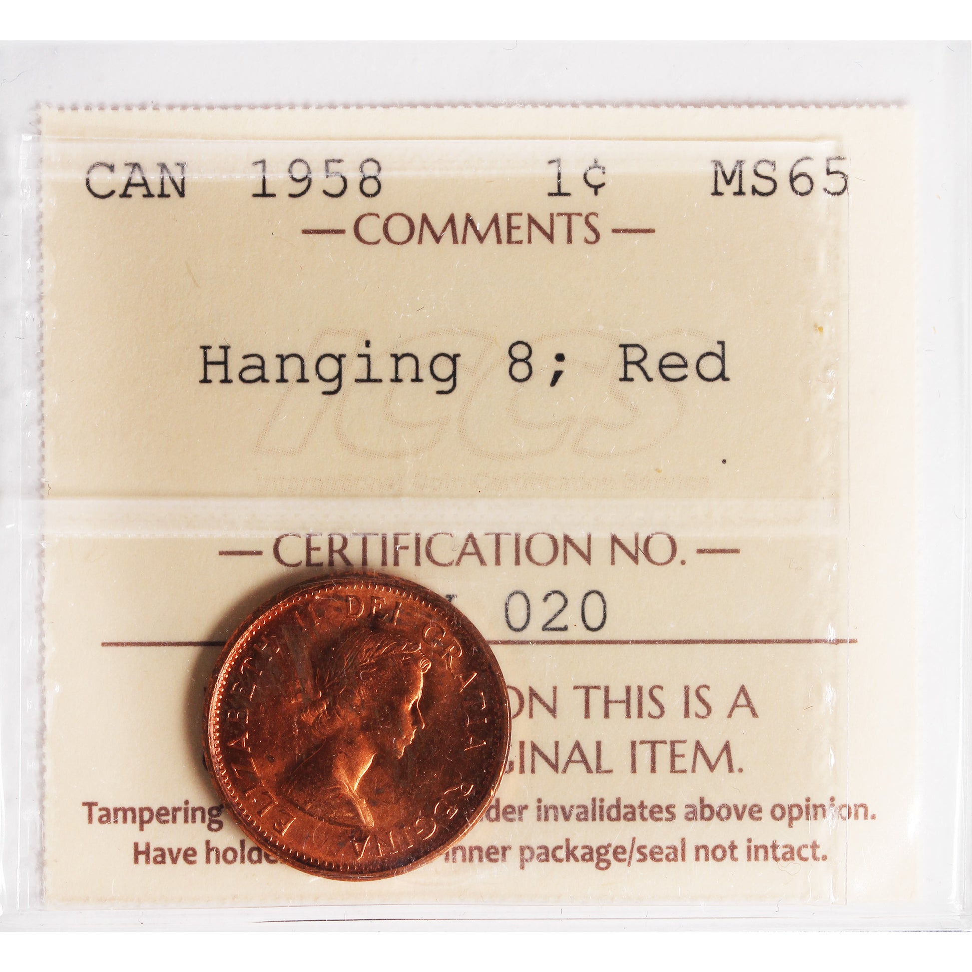 1958 Hanging 8 Canada 1-cent ICCS Certified MS-65 Red