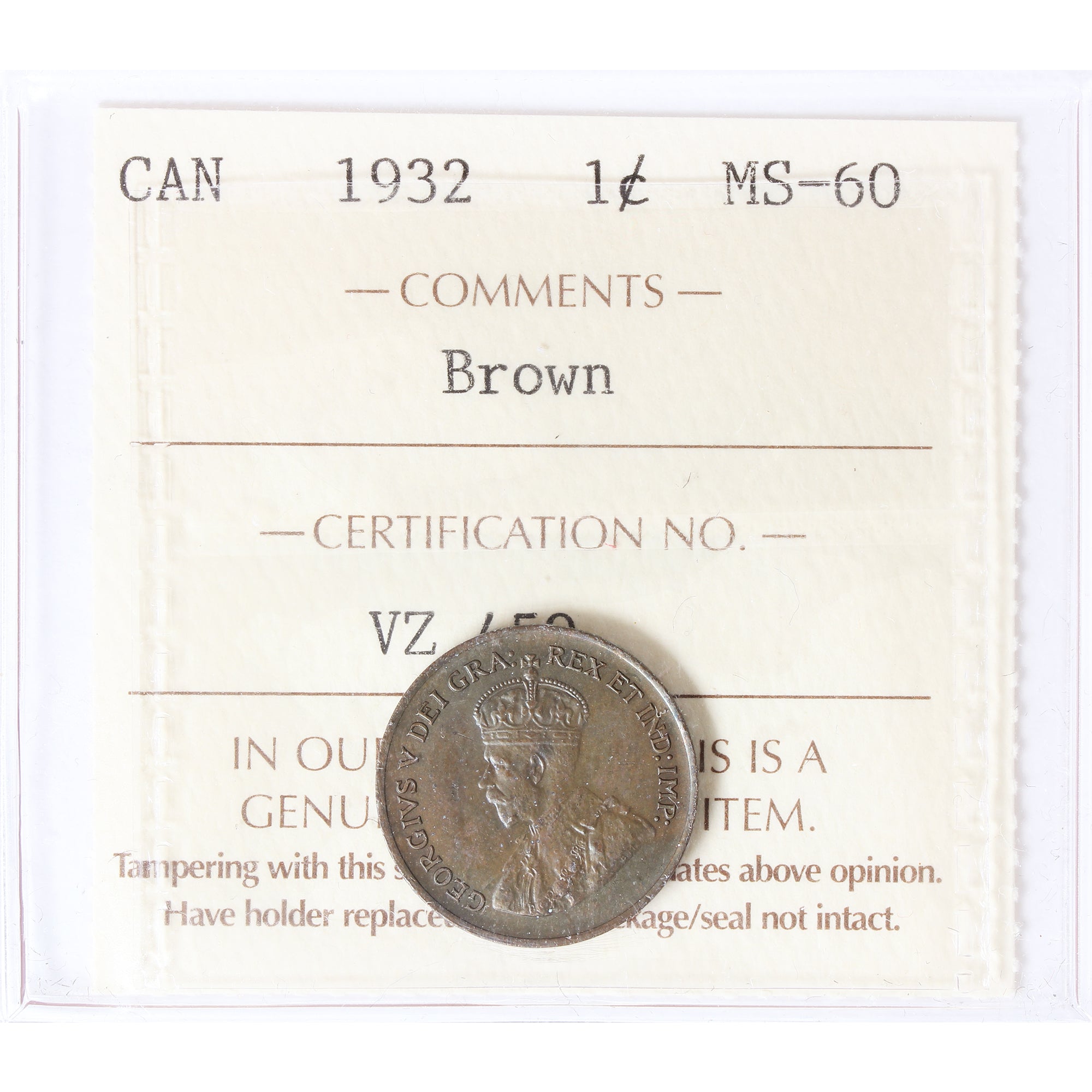 1932 Canada 1-cent ICCS Certified MS60 Brown
