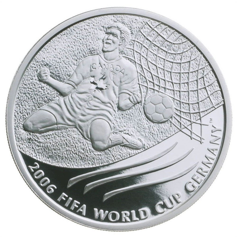 The Royal Canadian Mint is issuing a coin to honour the "2006 FIFA World Cup Germany™" An exciting 99.99% fine silver, proof-finished coin brings the energy of the game to life. The reverse of the coin features a soccer player celebrating the scoring of a goal and the obverse depicts the effigy of Her Majesty Queen Elizabeth II.