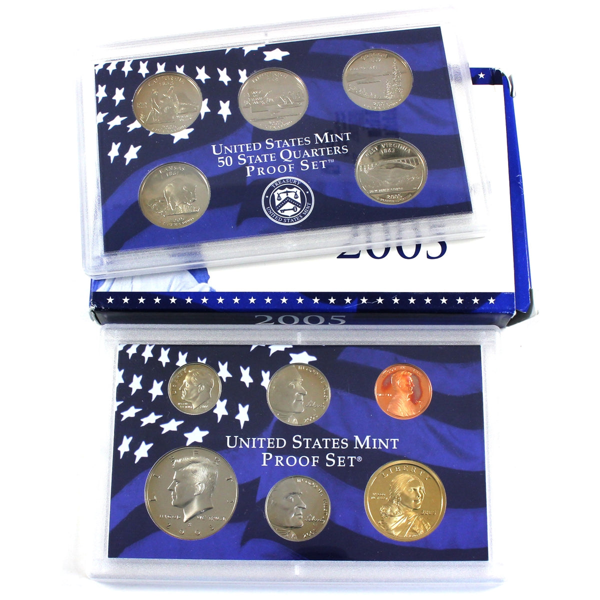 2005 S United States Mint Proof Set (Coins may be lightly toned, light wear on envelope/ plastic case). Includes the five State Quarters (California, Minnesota, Oregon, Kansas, and West Virginia), the Ocean in View and Buffalo nickels, and the four other denominations in clear plastic cases, along with a CoA.