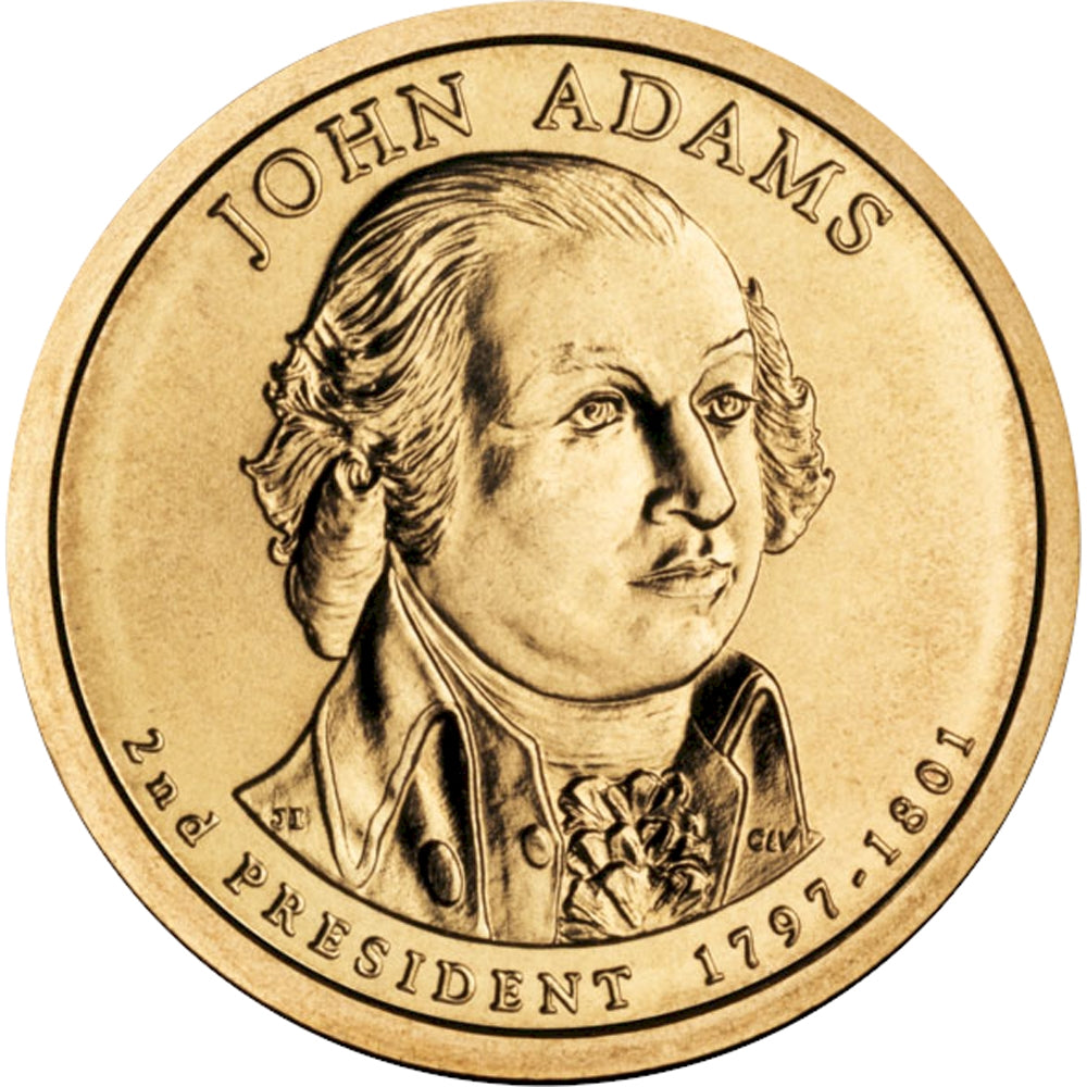 The obverse includes the inscriptions "John Adams," "2nd President," and the years of his presidential term "1797-1801." The reverse inscriptions include "United States of America," and the denomination "$1." The date and mint mark are located on the edge inscription of the coin along with the mottoes "In God We Trust" and "E Pluribus Unum."