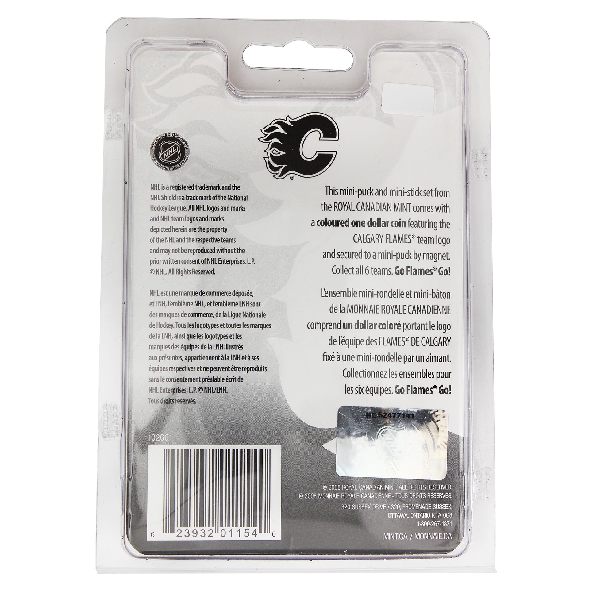 This package features the Calgary Flames coin, a mini-puck keychain, and a 5" mini hockey stick. This item can be preserved in a clear clamshell case but can be taken out and used for a mini hockey game. Simply remove the mini-puck from the keychain and use it with the hockey stick. This 2009 $1 Calgary Flames Mini Puck Keychain & Hockey Stick is a perfect gift or addition to a hockey lover’s collection.