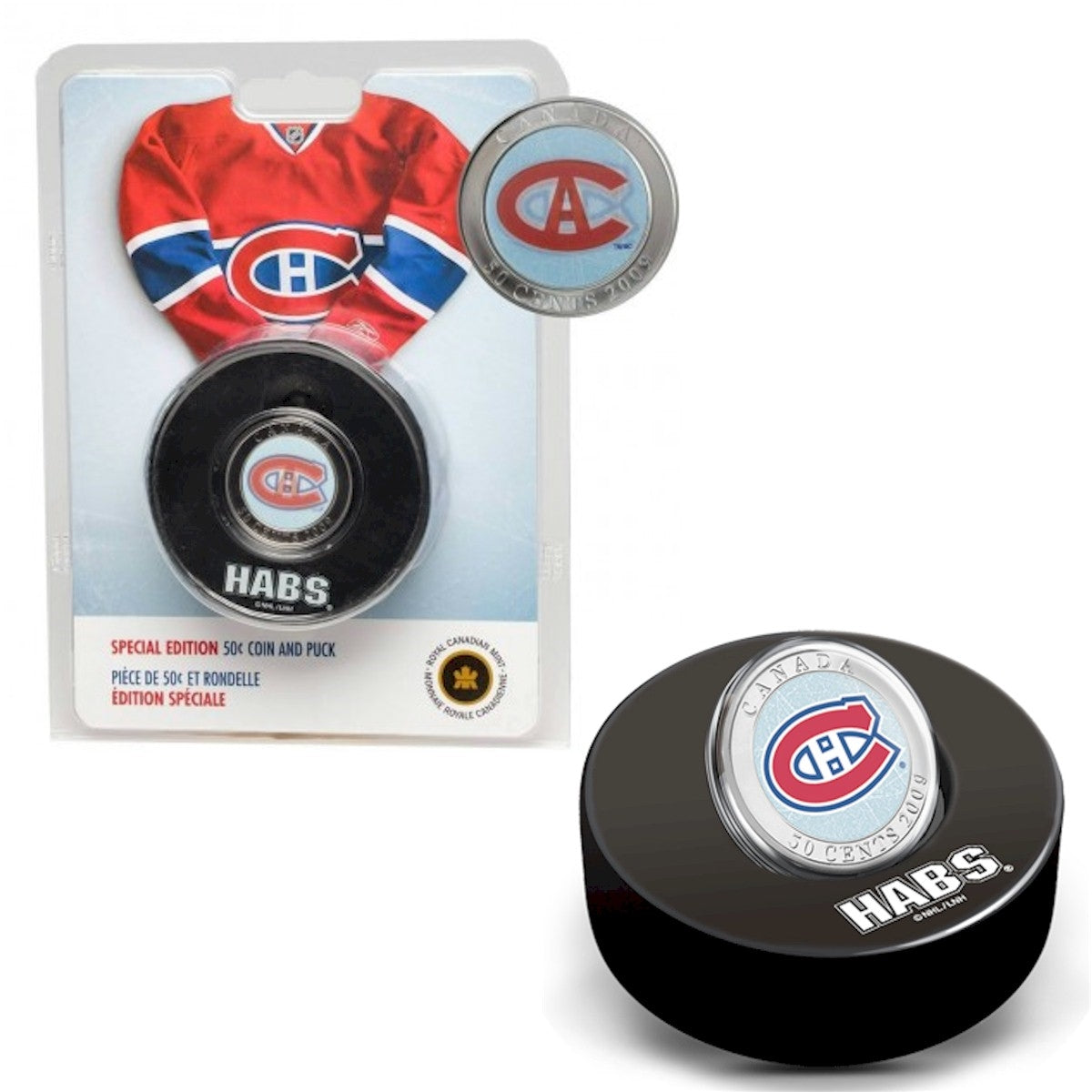 On or off the ice, all eyes will be on this regulation NHL hockey puck featuring a unique, dual-image 50-cent Montreal Canadiens coin in full colour embedded right in the puck! When the special edition lenticular coin is rotated, the image transforms from the old Habs logo to the new one!