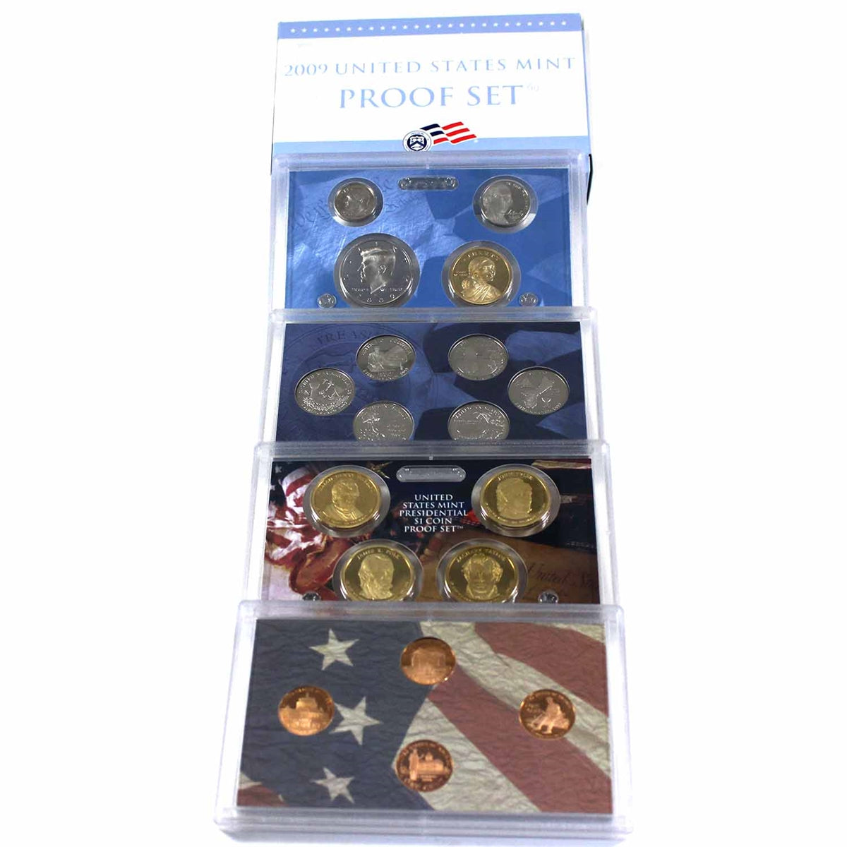 2009 S United States Mint Proof Set (Coins, sleeve, and case may be lightly toned, and/ or have wear.). This is the non-silver version. Includes the four commemorative Lincoln cents, the Native dollar, half dollar, dime, and nickel, the four Presidential dollars (Harrison, Tyler, Polk, and Taylor), and the six D.C. and Territories quarters (D.C., Puerto Rico, Guam, American Samoa, U.S. Virgin Islands, and Northern Mariana Islands), along with CoA.