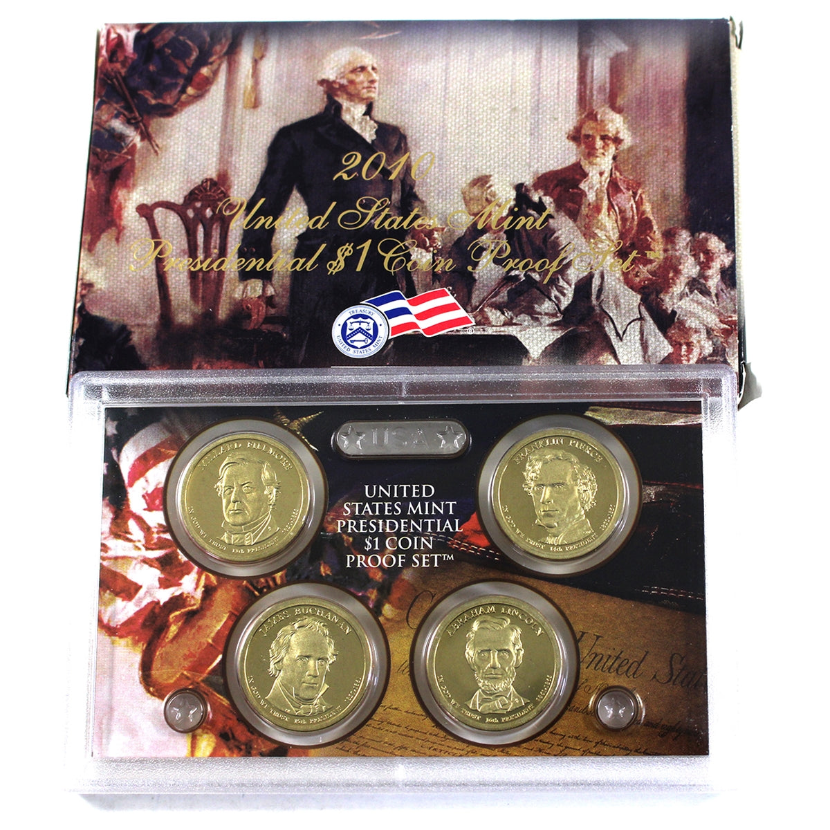 2010 United States Mint Presidential $1 Coin Proof Set (Slightly toned, light wear on sleeve/ case). Includes CoA. Features Fillmore, Pierce, Buchanan, and Lincoln.