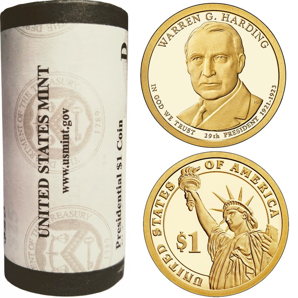 This 2014 Warren G. Harding Presidential $1 Coin 25-Coin Roll contains 25 circulating quality coins minted at the United States Mint at Philadelphia that have never been placed into circulation.