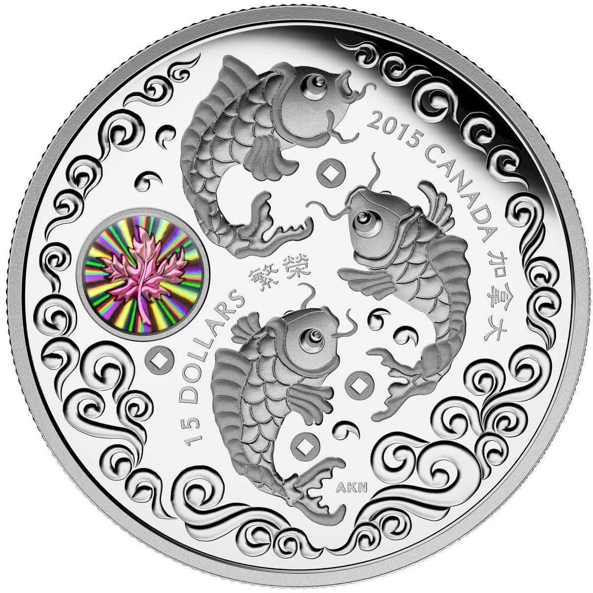 This is the seventh coin in the Royal Canadian Mint's Asian-inspired coins, bearing a hologram of a maple leaf. The reverse design by Canadian artist Albert Ng is a popular arrangement of elements that convey a blessing for prosperity. Fish have long represented "abundance/surplus" due to the similarity in the pronunciation of their Chinese characters. Carp is a particularly auspicious symbol as well, both for its reputation as a prolific producer of eggs as well as its symbol's similar pronunciation to the characters for "profit" and "power." In a lucky grouping of three, the carp are seen jumping out of the water (in itself symbolic of continuous abundance), which is represented by a repetitive pattern of rippling water that frames the reverse image. This thoughtful, intricate design represents "gaining profits in succession".
