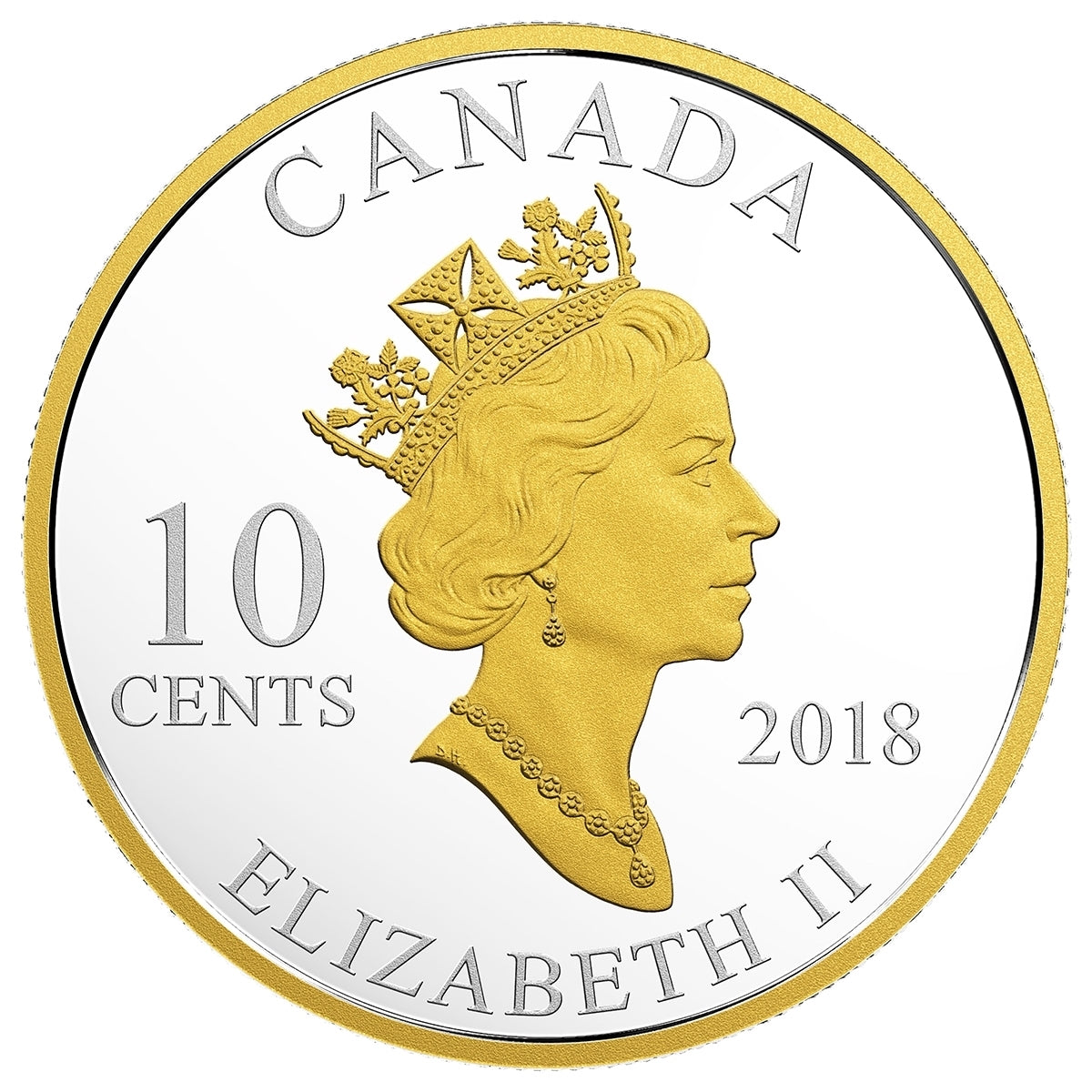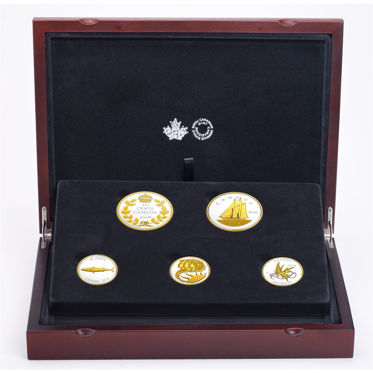 The Legacy of the Dime set is a unique retrospective look at Canada's 10-cent circulation coin through the years, as struck by the Royal Canadian Mint. More than twice the size of the original issue, these selectively gold-plated pieces are an enduring tribute to the five designs that have graced the diminutive-sized canvas, upon which history itself has been etched.