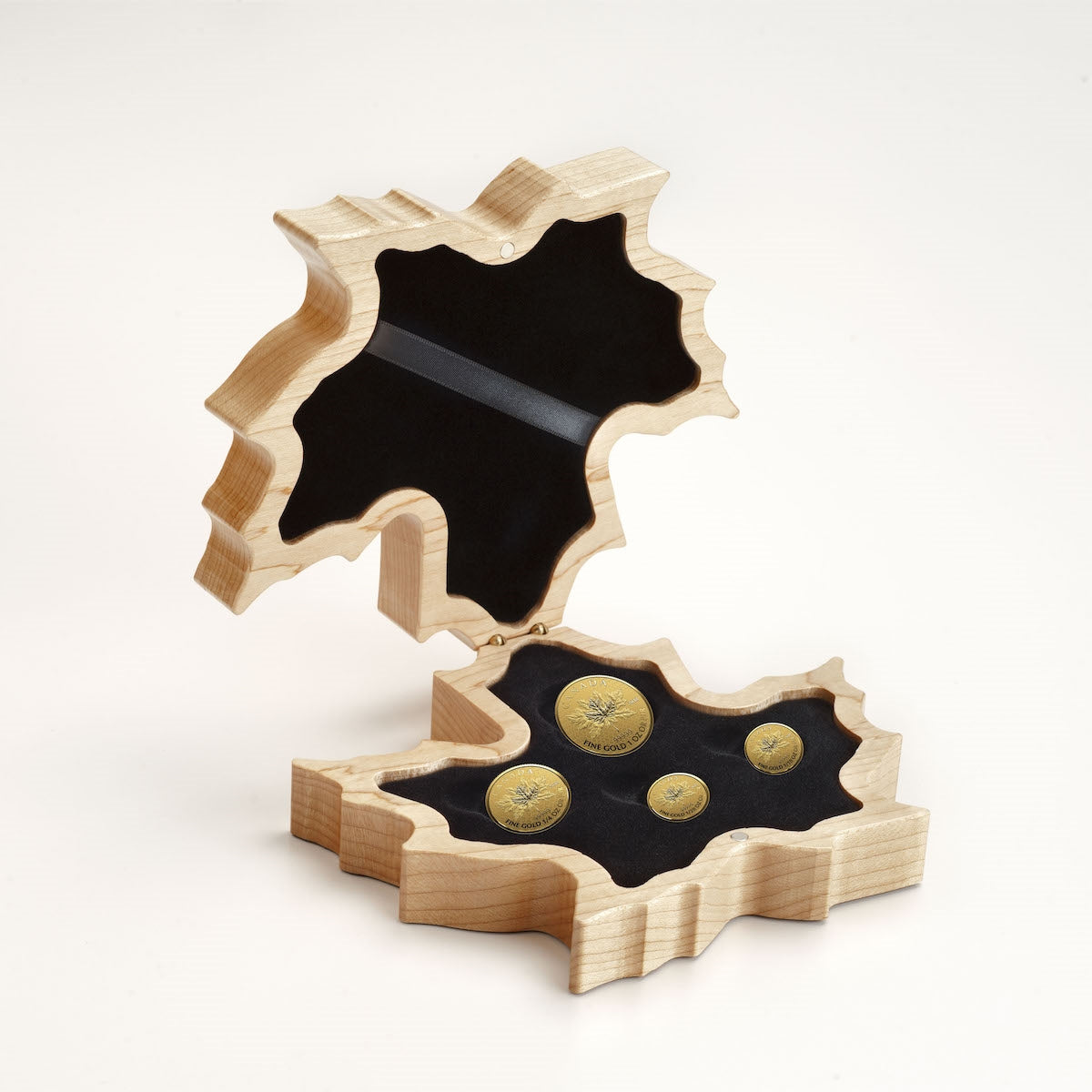 • All four coins are packaged together and ready for display in a deluxe maple leaf-shaped, maple wood case.