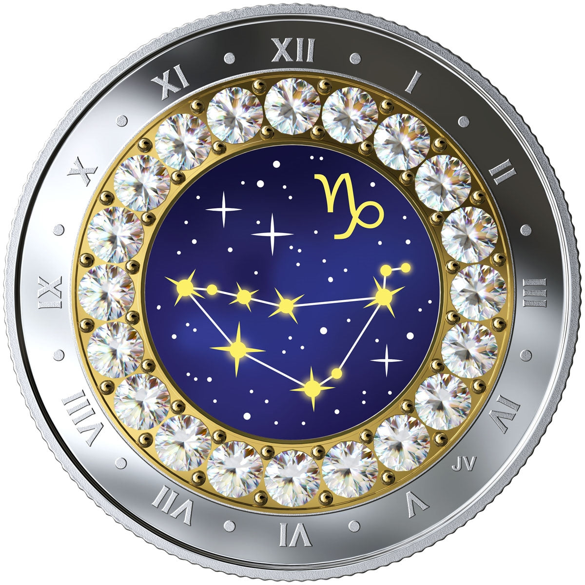 One by one, the 12 zodiac constellations rise and march across the night sky in the Royal Canadian Mint's 2019 Zodiac series. The first coin is dedicated to the determined Capricorn (December 22-January 20), whose constellation is framed by 20 Swarovski crystals that sparkle like the stars.