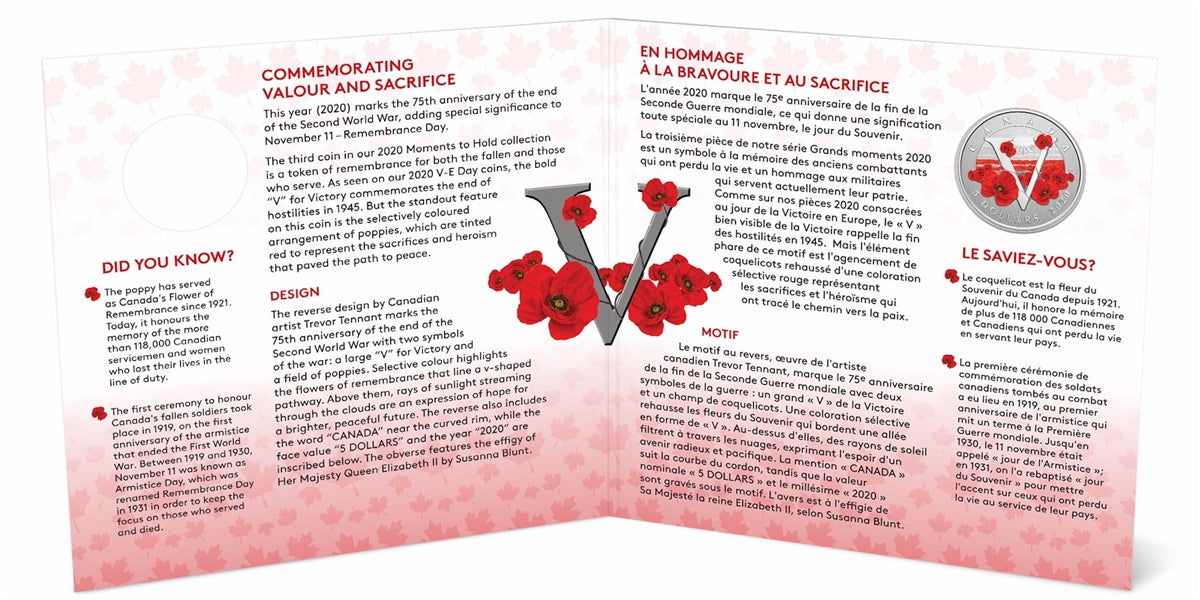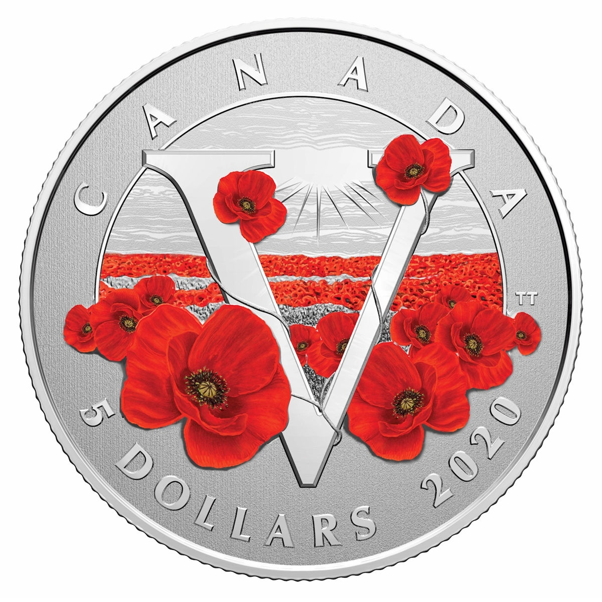 The reverse design by Canadian artist Trevor Tennant marks the 75th anniversary of the end of the Second World War with two symbols of the war: a large "V" for Victory and a field of poppies. Selective colour highlights the flowers of remembrance that line a v-shaped pathway. Above them, rays of sunlight streaming through the clouds are an expression of hope for a brighter, peaceful future. The reverse also includes the word "CANADA" near the curved rim, while the face value "5 DOLLARS" and the year "2020" are inscribed below. The obverse features the effigy of Her Majesty Queen Elizabeth II by Susanna Blunt.