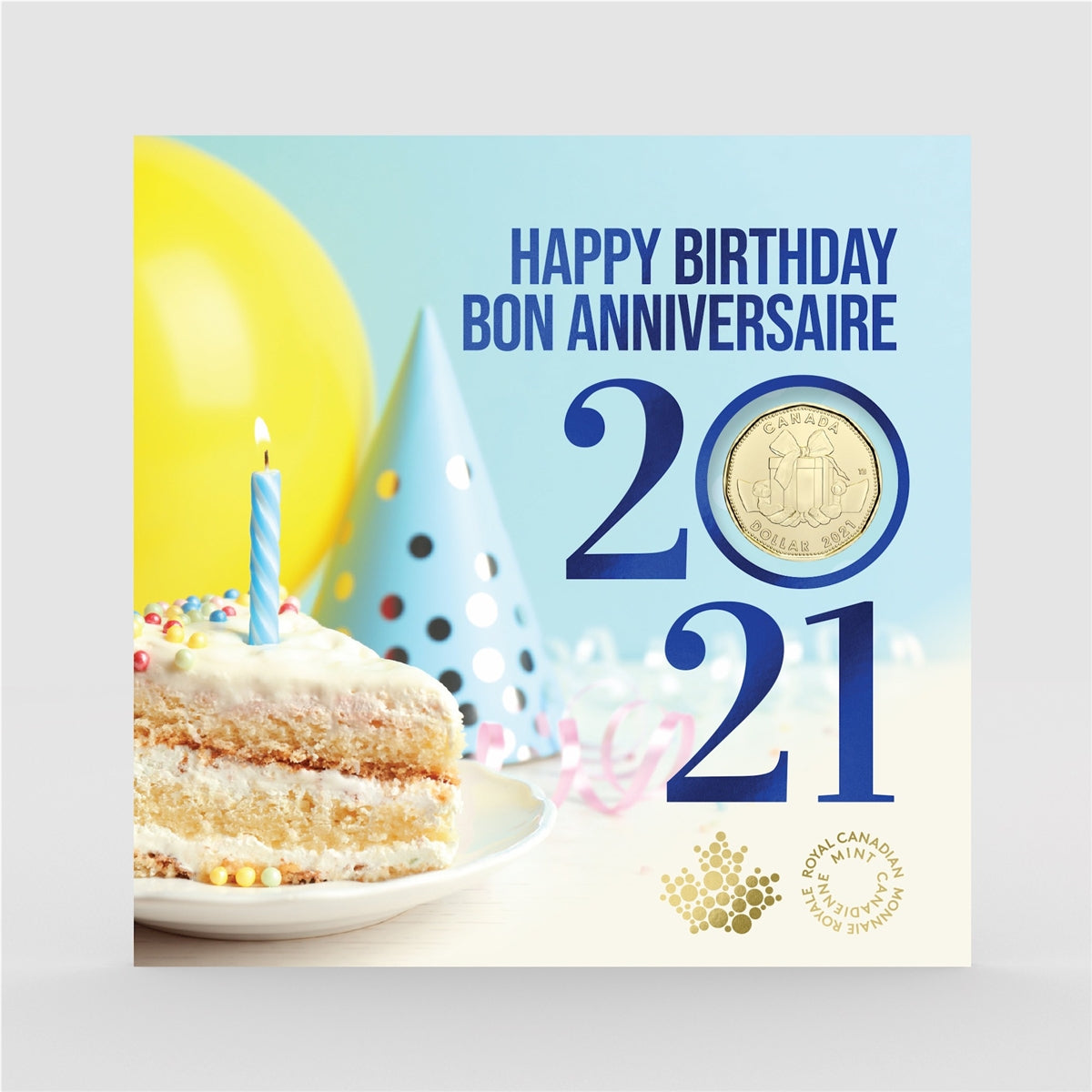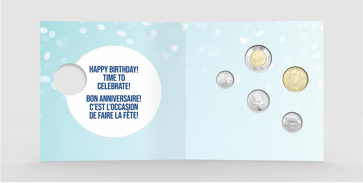 This year's Birthday Gift Set release from the Royal Canadian Mint is truly something special. Reminiscent of a birthday party, the folder pictures a slice of delicious birthday cake, a festive party hat and yellow balloon! This year's loon dollar features two hands presenting a beautifully wrapped birthday present.