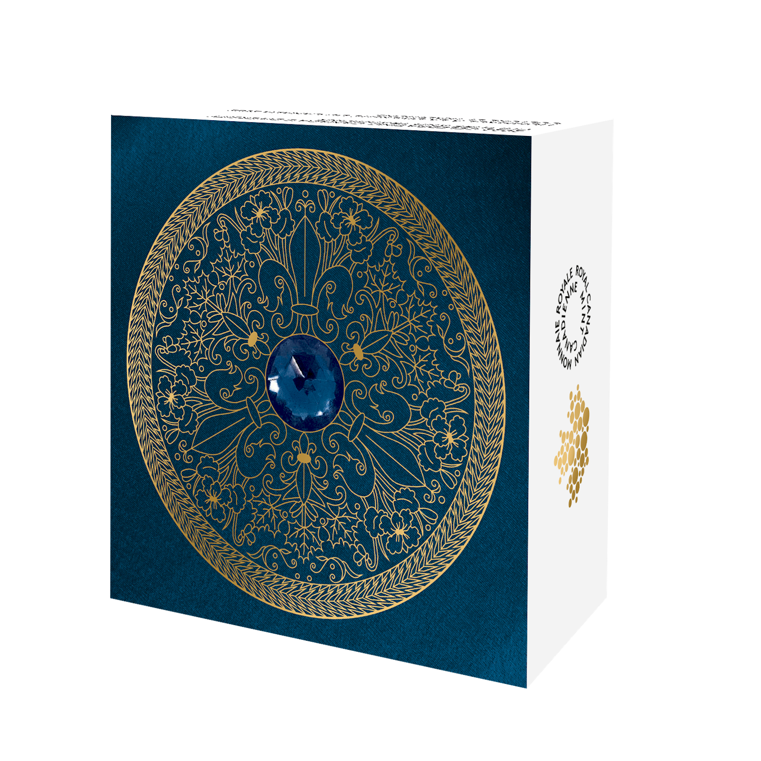 The reverse design by Canadian artist Hélène Girard features a grade AAA rose cut blue sapphire at its centre, where the gemstone’s blue hue represents Canada’s Francophone spirit. The gemstone is surrounded by an engraved arrangement of repeating ornamental flourishes and emblems associated with French heritage in Canada, including: the fleur-de-lis, a symbol that evokes the wider French-speaking community; the blue flag iris, the floral emblem of Quebec; the purple violet, the floral emblem of New Brunswick; and maple leaves that represent all Francophone communities in Canada. The iconic ceinture fléchée (arrow sash) surrounds the design, embracing all the individual elements as a whole. The obverse features the effigy of Her Majesty Queen Elizabeth II by Susanna Blunt.
