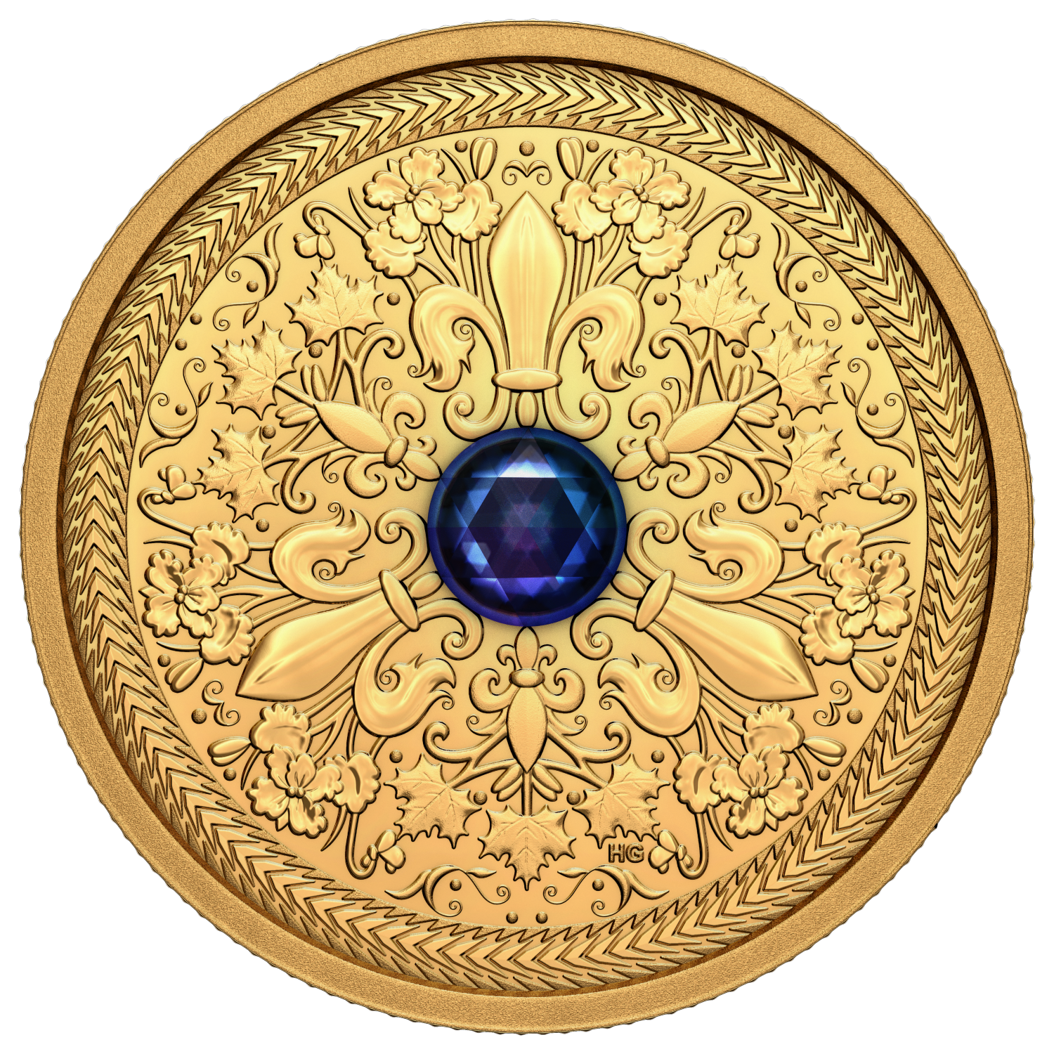 • A stunning sapphire! The coin features a grade AAA natural blue sapphire. The 0.75 carat rose-cut gemstone adds a captivating colour to this design while representing Canada’s Francophone spirit.
