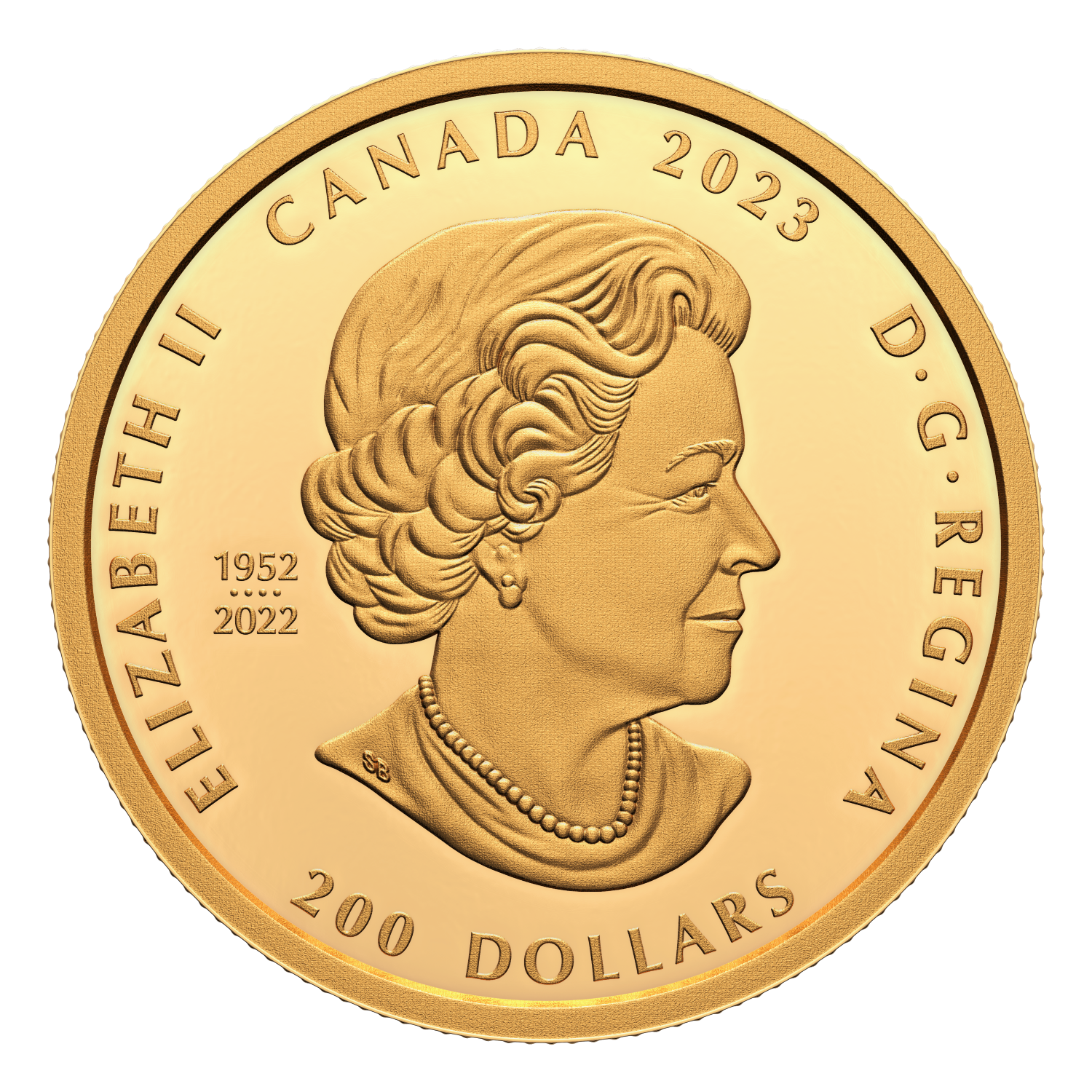 The reverse design by Haida artist Yahl ‘Aadas Cori Savard features an abalone shell inlay surrounded by engraved motifs that honour Haida beliefs and values. The ovoid and U shapes on the outer ring represent the eyes of the Haida Elders and knowledge holders who watch over the younger generations, represented by the inner ring. The repetitive patterns flow into one another, as knowledge is passed down from one generation to the next, while the intertwined cedar rope further reinforces this notion of interconnection—of generations, of land and sea. The obverse features the effigy of Her Majesty Queen Elizabeth II by Susanna Blunt. The obverse also bears a special marking that includes four pearls symbolizing the four effigies that have graced Canadian coins and the double date of her reign.