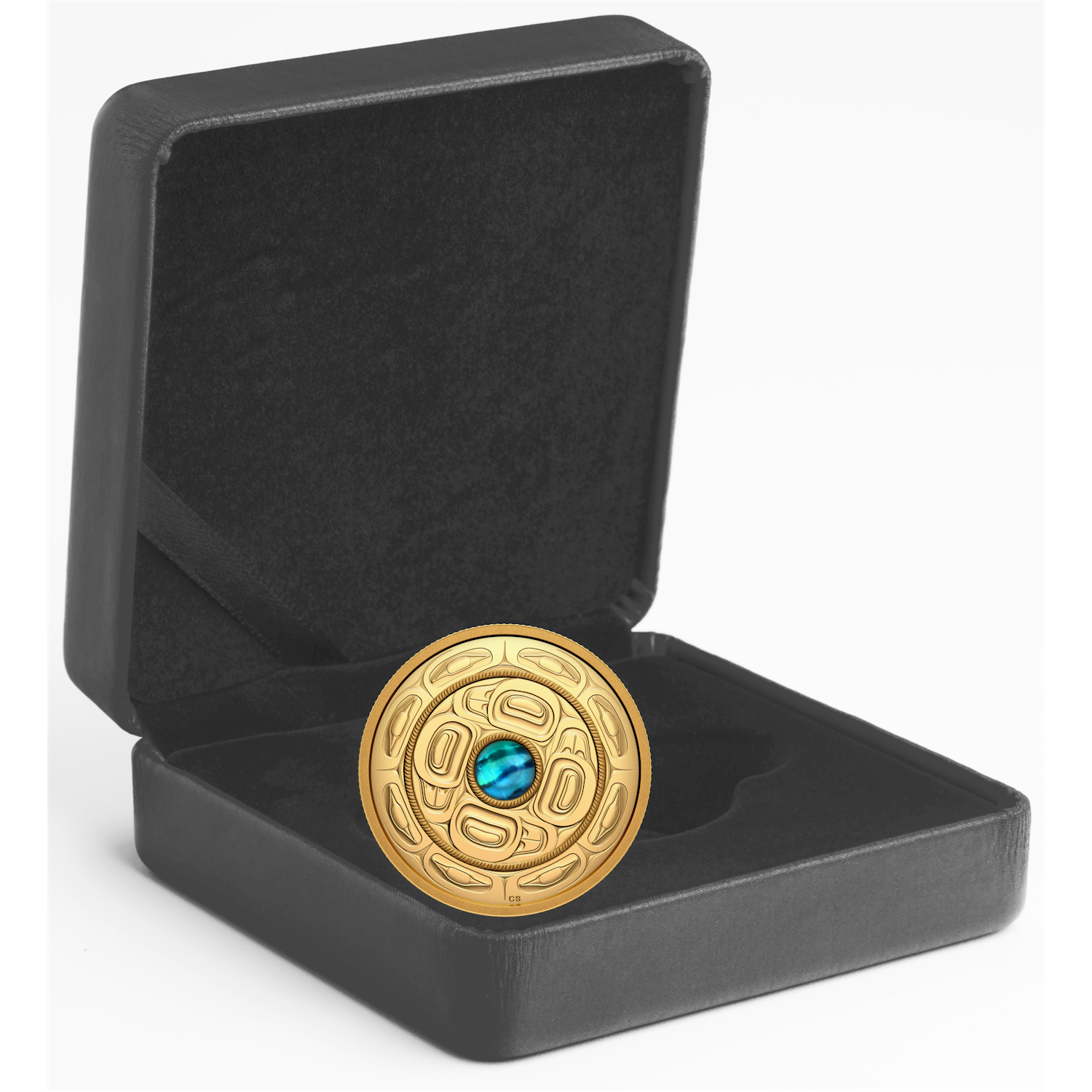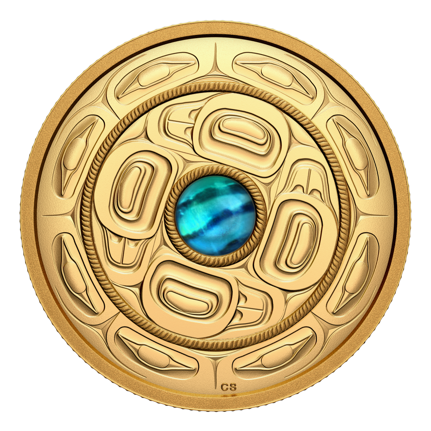 • Iridescent abalone shell. With its swirling blues and greens that call to mind the colours of the Pacific Ocean, the coin’s abalone shell centrepiece is an organic gem that symbolizes the Haida people’s deep connection with the sea.