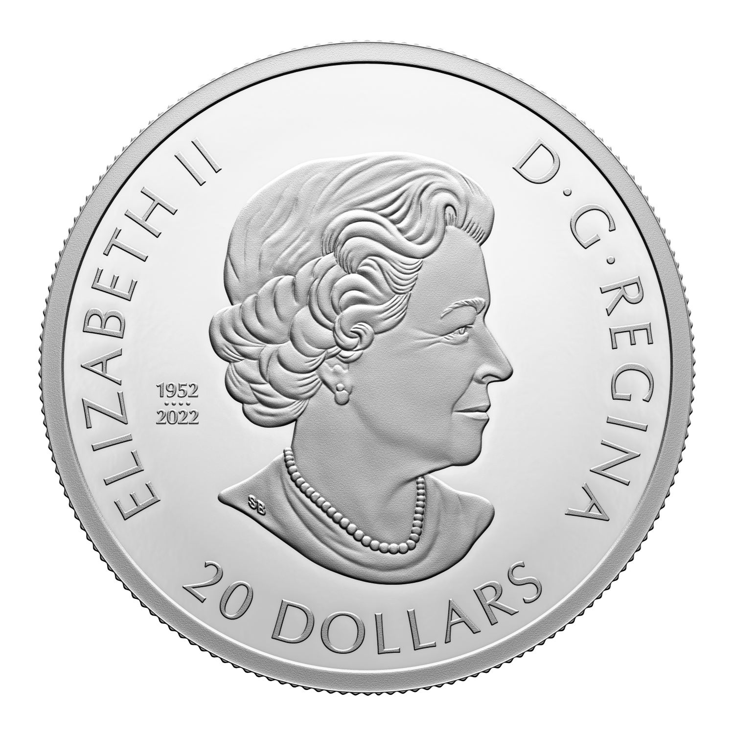 The reverse design by Canadian artist Silvia Pecota depicts a powerful moment at the National War Memorial in Ottawa, Ontario. A Veteran lays a red poppy on the Tomb of the Unknown Soldier, where many have already placed theirs as a show of respect. By involving his grandchild, he is helping to ensure that the traditions of Remembrance will be carried forward through the years by each new generation of Canadians. The obverse features the effigy of Queen Elizabeth II by Susanna Blunt. The obverse also bears a special marking that includes four pearls symbolizing the four effigies that have graced Canadian coins and the double date of her reign.