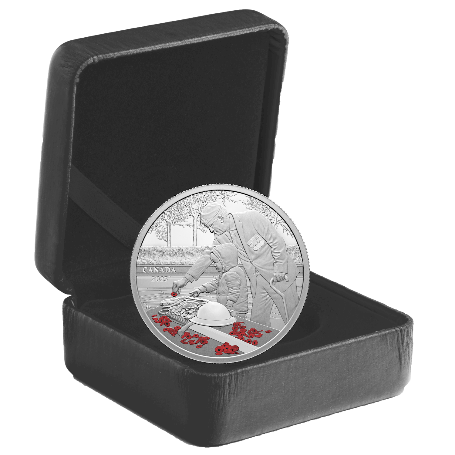 • A nation's pledge to never forget. Set at a hallowed site of national remembrance, the scene on the coin’s reverse depicts a Veteran involving his grandchild in an act of Remembrance, thereby helping to ensure that the traditions — and the promise to never forget — will be carried forward by each new generation of Canadians.