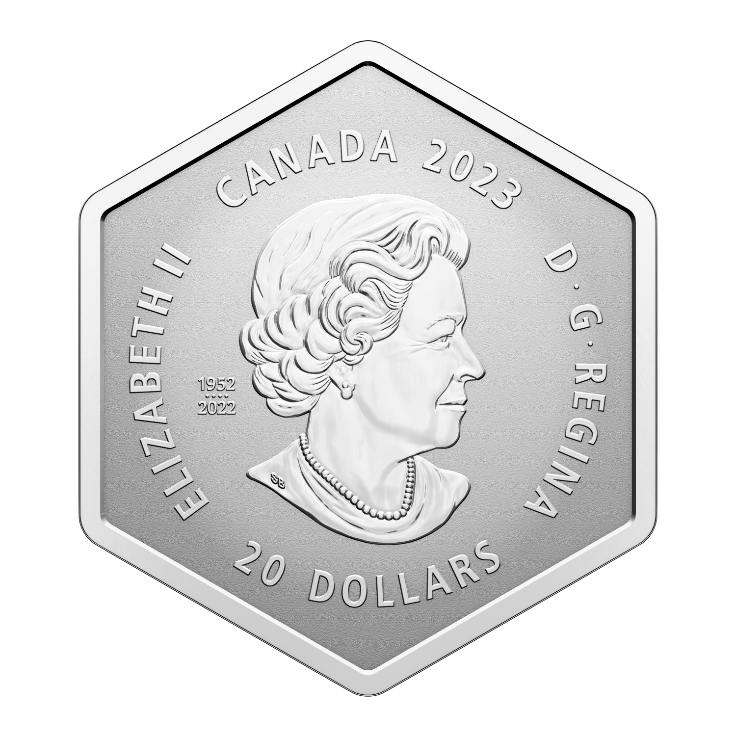 • New coin shape. A first for the Royal Canadian Mint, this hexagon coin introduces a six-sided shape that perfectly complements the six-sided snow crystal engraved on its reverse.