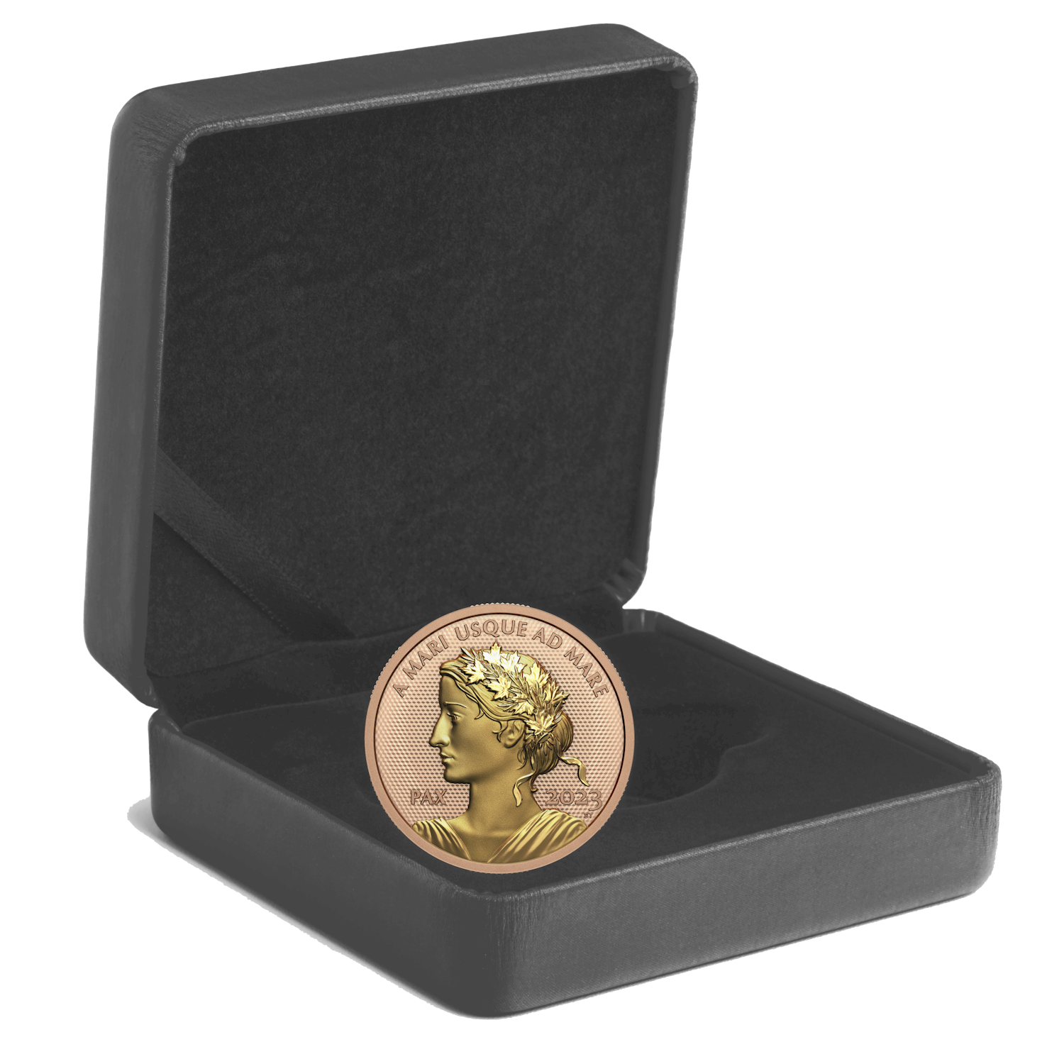 The Peace Dollar’s reverse features selective rose gold plating and a pulsating pattern behind the allegorical image of peace designed by retired RCM Senior Engraver Susan Taylor. Struck in Ultra High Relief (UHR), Lady Peace is depicted in profile with her hair crowned in a wreath of maple leaves and olive branches. She is flanked by her name “PAX” (the Latin word for “Peace”) and the year “2023”, while Canada’s national motto, “A MARI USQUE AD MARE” (“From sea to sea”) appears overhead. The obverse also features selective rose gold plating and the effigy of Her Majesty Queen Elizabeth II by Susanna Blunt.