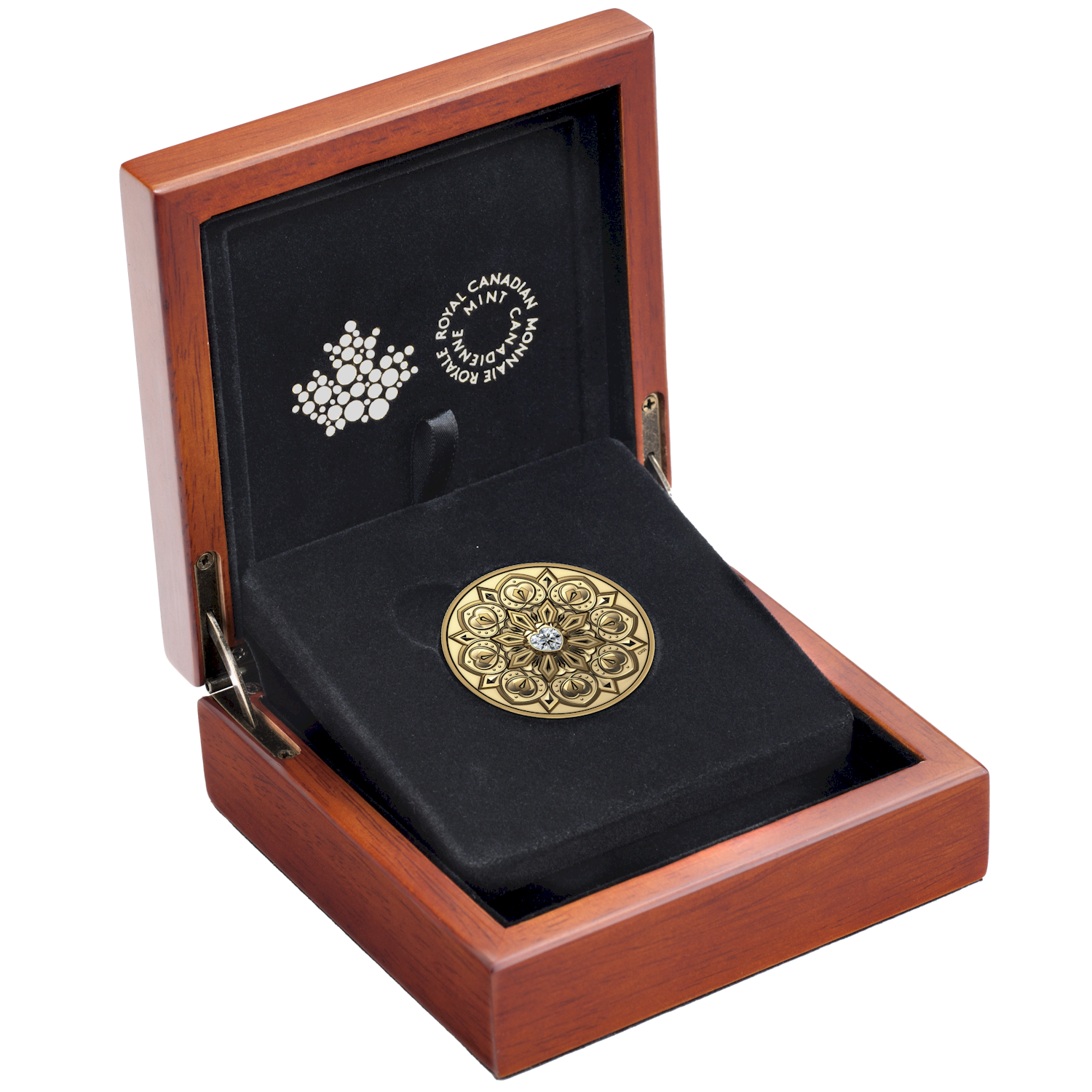 • Two certificates of authenticity! The coin comes in a wooden case packaged in a graphic beauty box that features a magnified view of the coin design. You also get TWO serialized certificates of authenticity: one from the Royal Canadian Mint; and one for the diamond, provided by Crossworks Manufacturing.