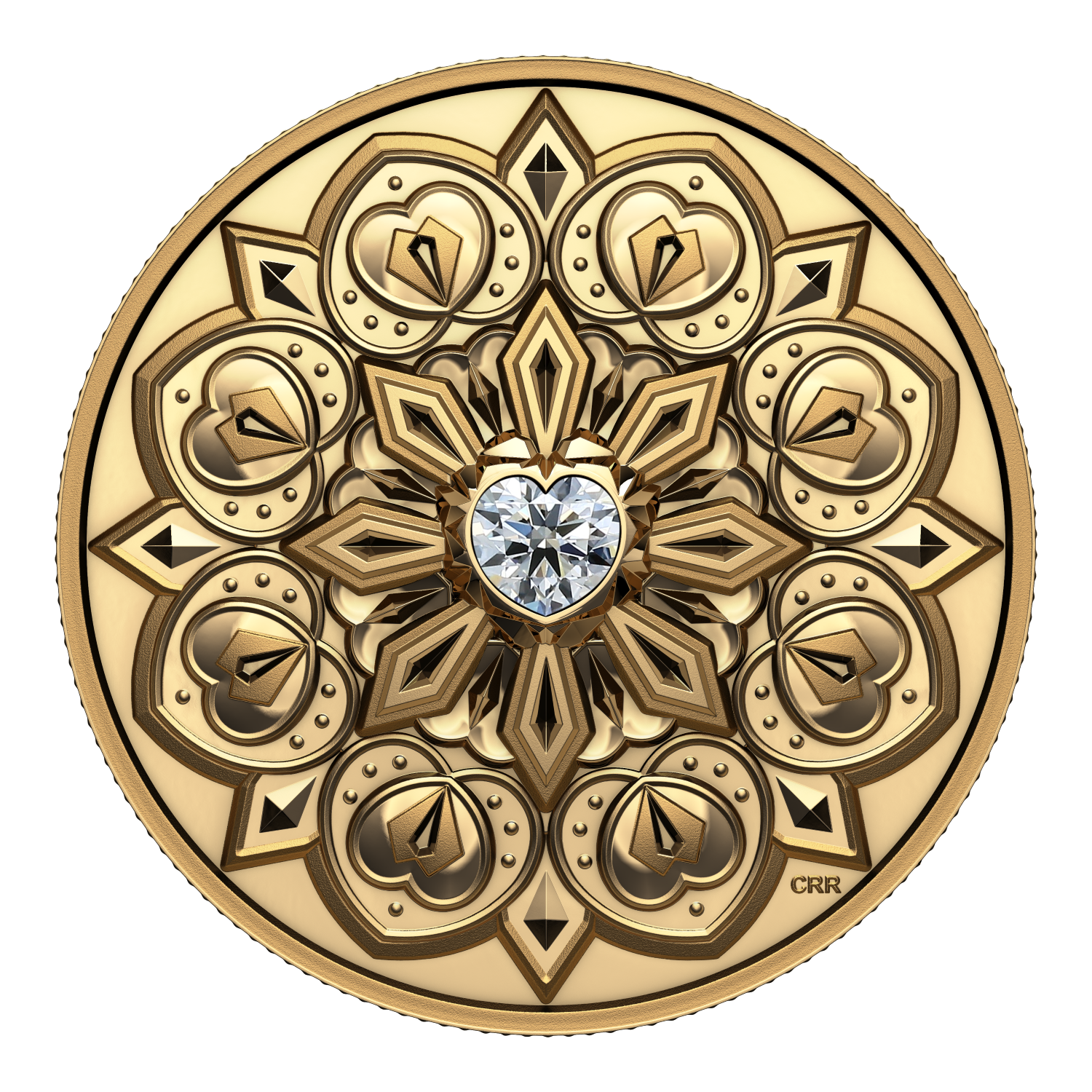 • Heart cut diamond. Last coin in this five-part series—complete your collection! In partnership with Canada’s premier diamantaire, Crossworks Manufacturing, each coin features a De Beers Ideal heart-shaped diamond, a patented cut that unleashes the spectacular beauty and fire within.