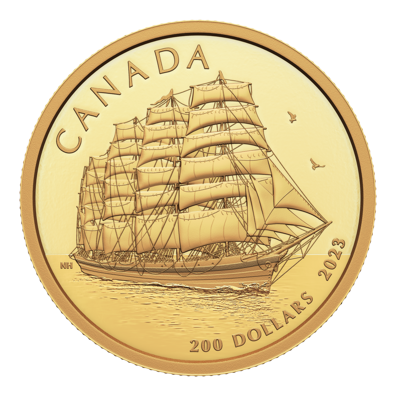 Inspired by the ships from Canada’s past, the reverse design by Canadian artist Neil Hamelin features an early morning view of a full-rigged ship sailing in calm waters with all sails set. The reverse includes the word “CANADA”, a face value of “200 DOLLARS” and the year “2023”. The obverse features the effigy of Queen Elizabeth II by Susanna Blunt. The obverse also bears a special marking that includes four pearls symbolizing the four effigies that have graced Canadian coins and the double date of her reign.
