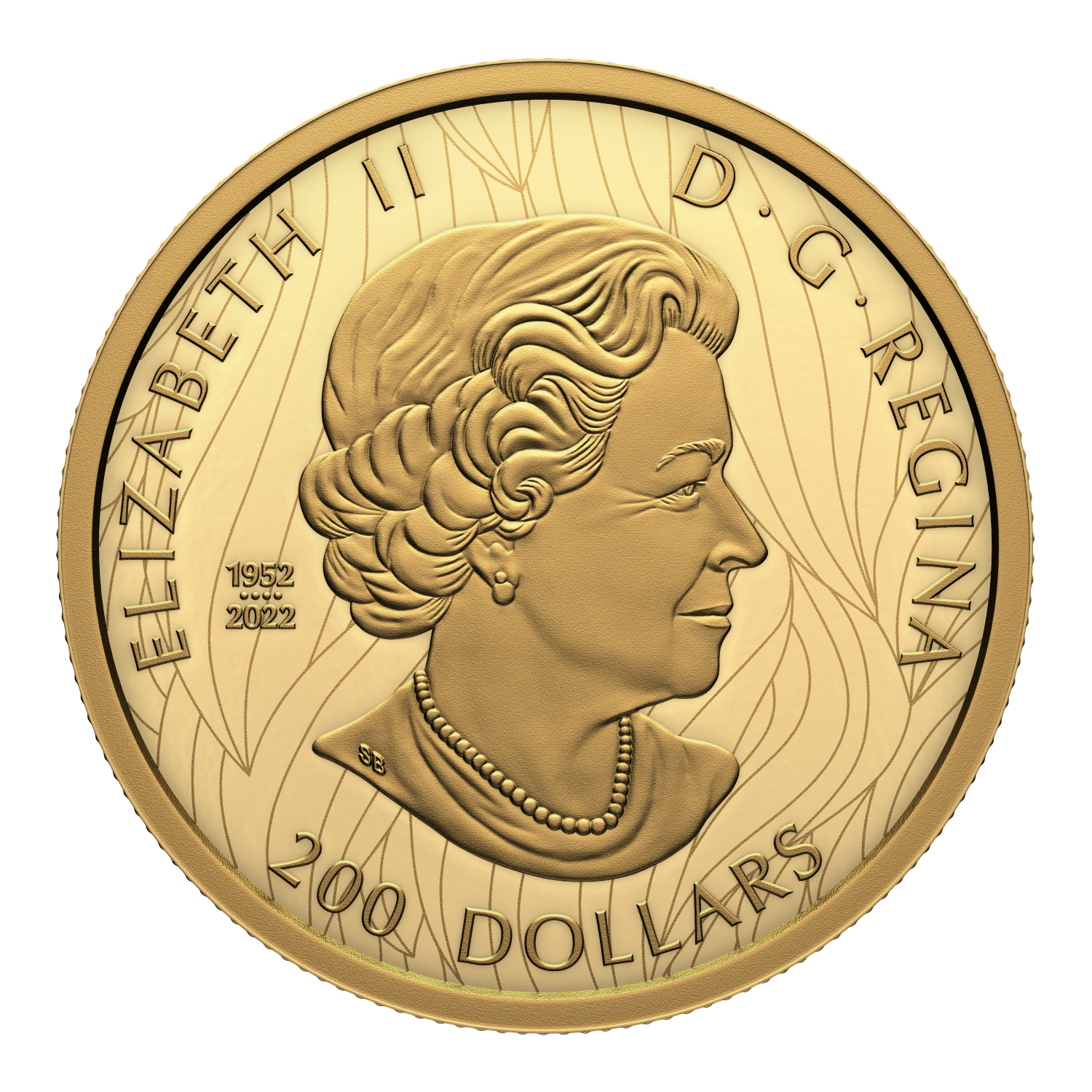 Designed by Canadian wildlife artist Claudio D’Angelo, the coin’s reverse features a portrait of two bald eagles (Haliaeetus leucocephalus) on a pine bough. These majestic raptors are positioned in a way that best showcases their features and also implies motion, with the perched eagle holding its wings outward while gazing at its companion, while the newly landed eagle tries to secure its grip. The obverse features a field pattern and the effigy of Queen Elizabeth II by Susanna Blunt. The obverse also bears a special marking that includes four pearls symbolizing the four effigies that have graced Canadian coins and the double date of her reign.