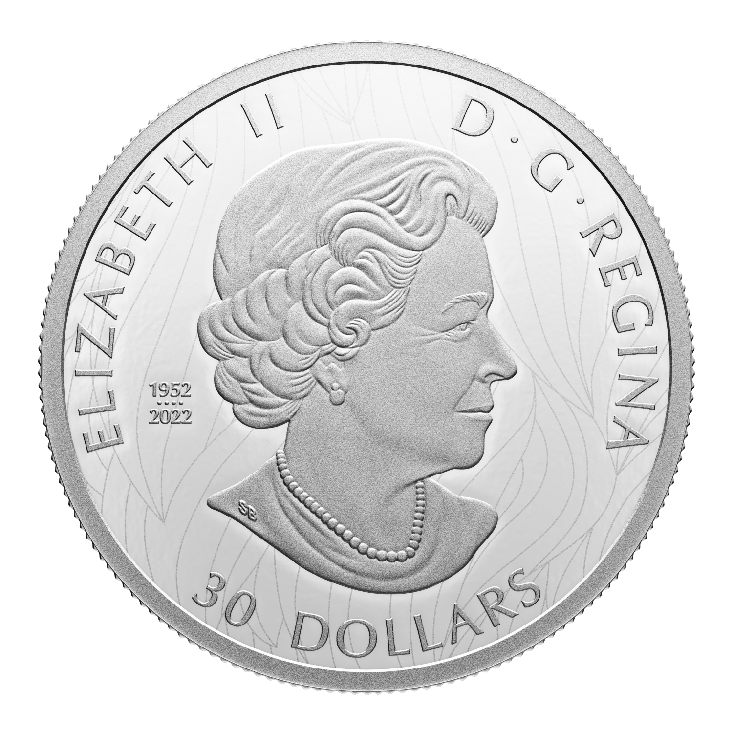 Designed by Canadian wildlife artist Claudio D’Angelo, your coin’s reverse features a portrait of two bald eagles (Haliaeetus leucocephalus) on a pine bough. These majestic raptors are positioned in a way that best showcases their features and also implies motion, with the perched eagle holding its wings outward while gazing at its companion, while the newly landed eagle tries to secure its grip. The obverse features a field pattern and the effigy of Queen Elizabeth II by Susanna Blunt. The obverse also bears a special marking that includes four pearls symbolizing the four effigies that have graced Canadian coins and the double date of her reign.