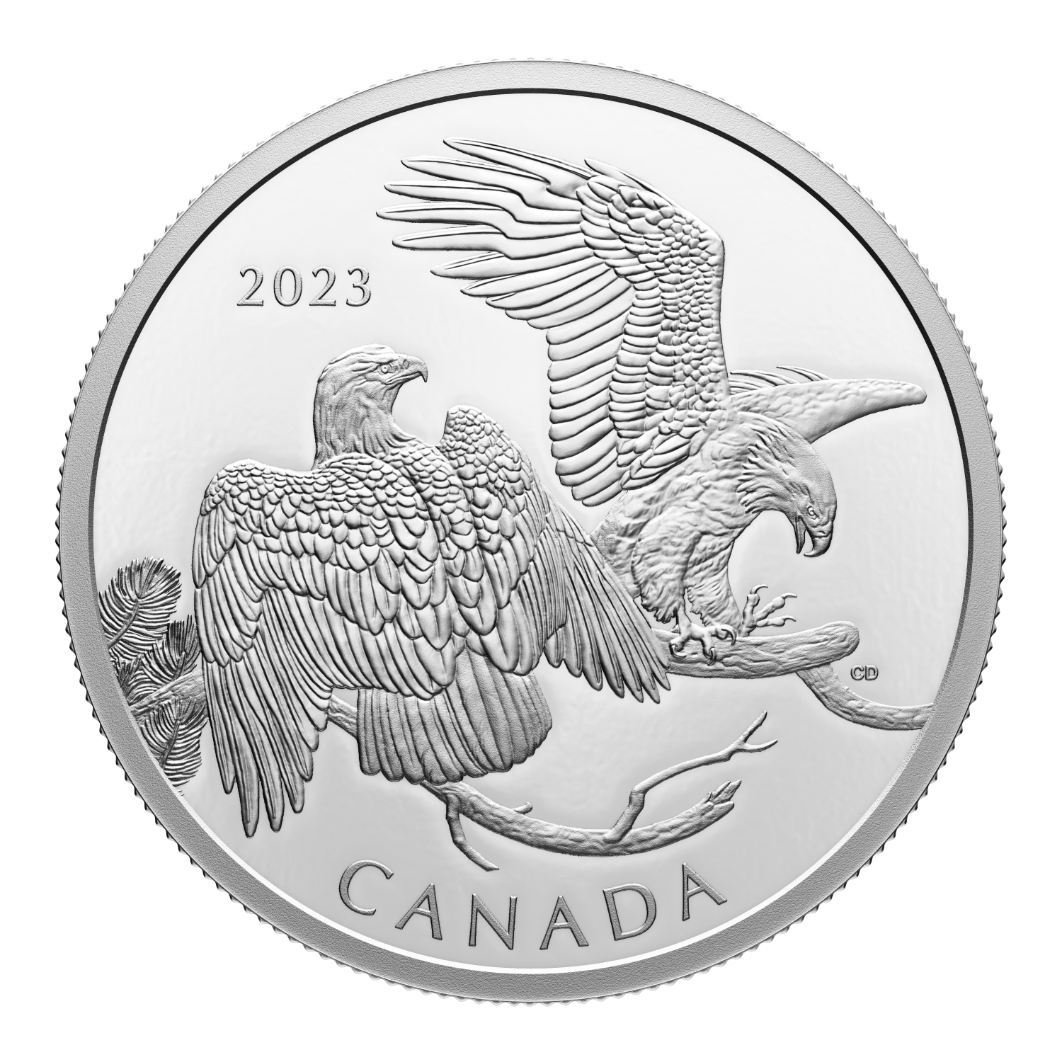 • An inspiring portrait. The follow-up to 2022’s The Mighty Bison, the coin’s reverse captures a rare moment in the wild, where the sight of not one but two bald eagles evokes a sense of awe and admiration.