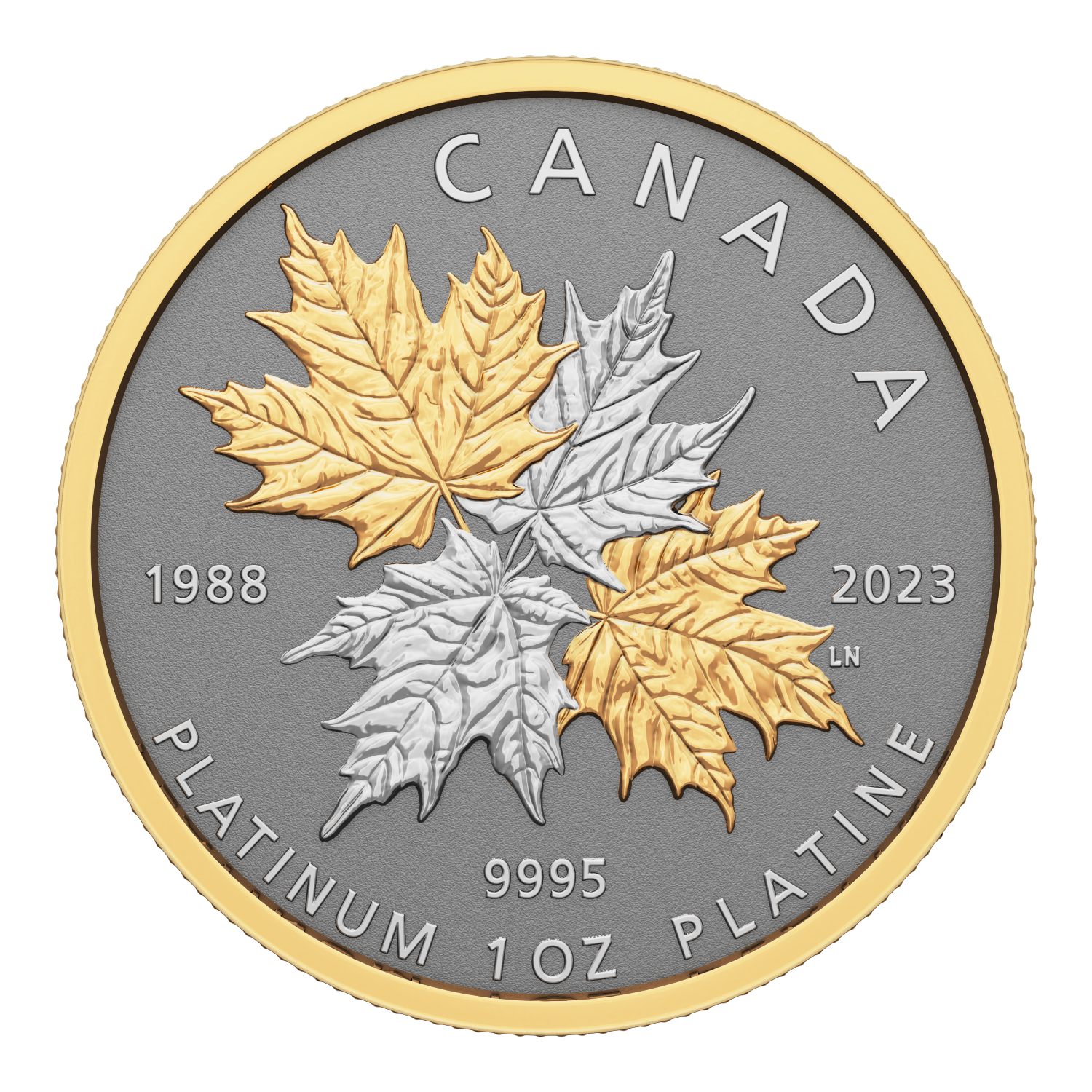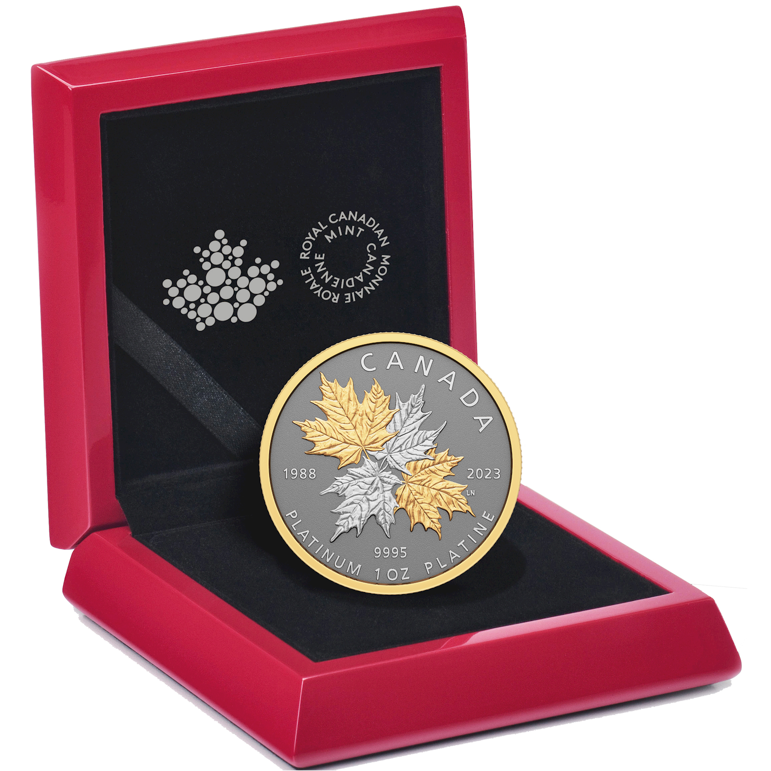 • An anniversary arrangement! Crafted in 99.95% pure platinum, the 2023 edition of our annual platinum maple celebration commemorates the 35th anniversary of the first 1 oz. Platinum Maple Leaf bullion coin issued in 1988.