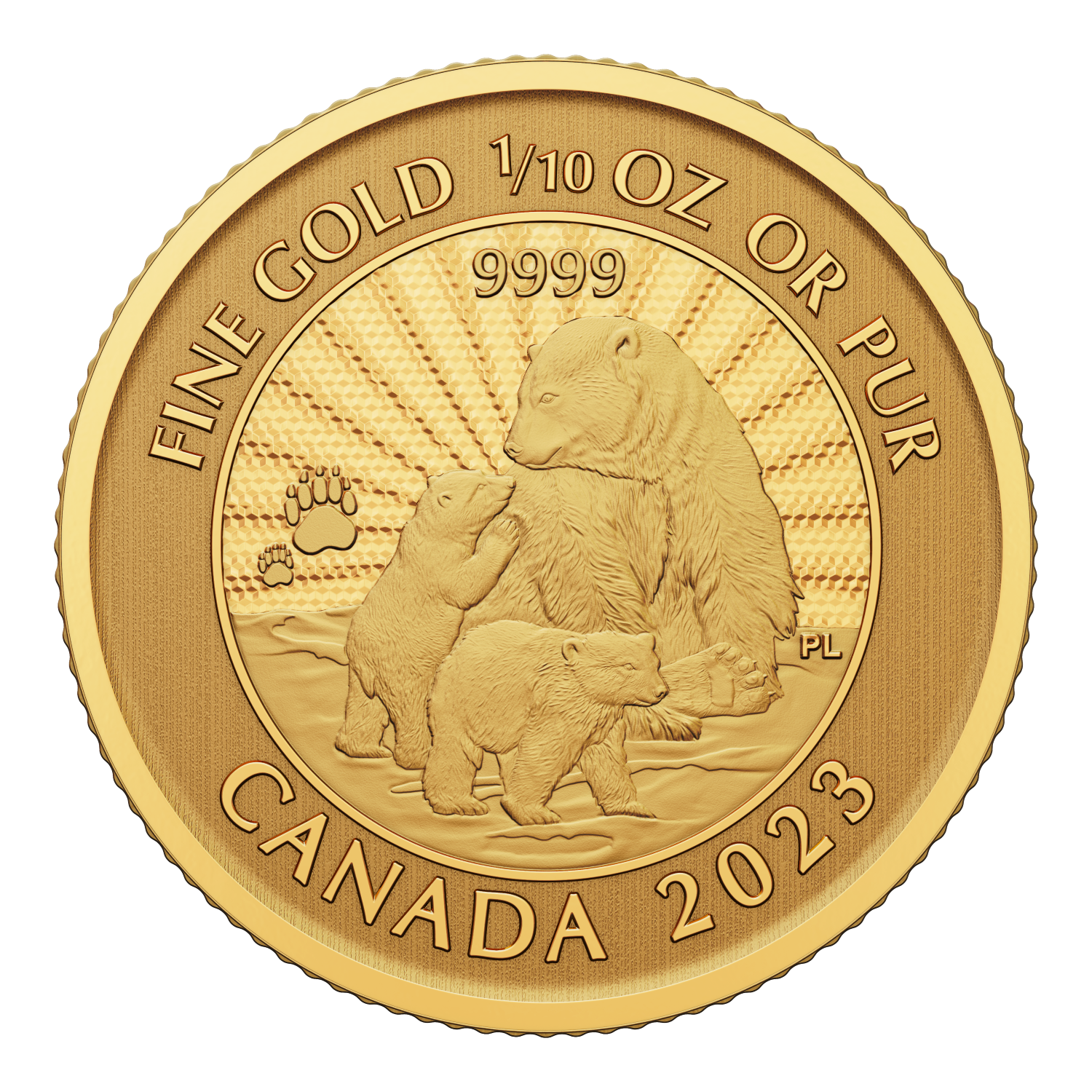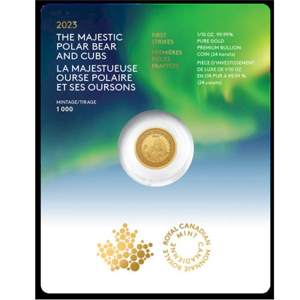 The 2023 all-gold edition is a touching Arctic wildlife portrait crafted in 24-karat (99.99% pure) gold and produced with a minimum guaranteed weight of 1/10 ounces. Designed for collectors and precious metal buyers alike, each Premium Bullion coin comes in a card holder that provides an unobstructed view of the coin’s many captivating features, including its sunburst finish and “mother-and-child” paw print privy mark.