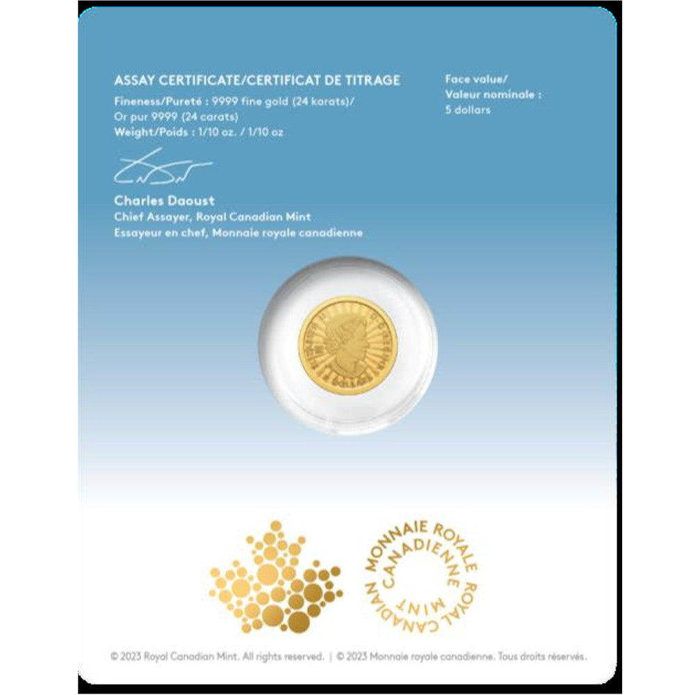 • Signed by the Mint's Chief Assayer, the assay certificate printed on the back of the card certified the coin's authenticity and gold purity. The pure gold Premium Bullion coin is crafted in 24-karat (99.99% pure) gold with a minimum guaranteed weight (1/10 oz.) and a low mintage of just 5,000 coins worldwide.